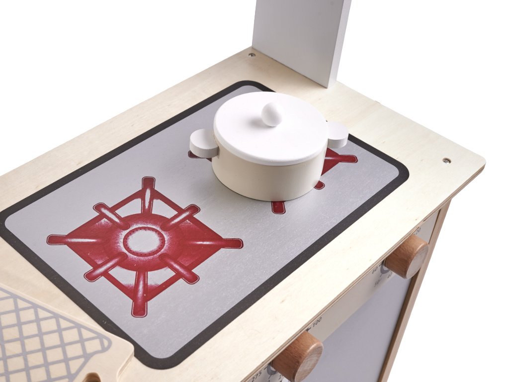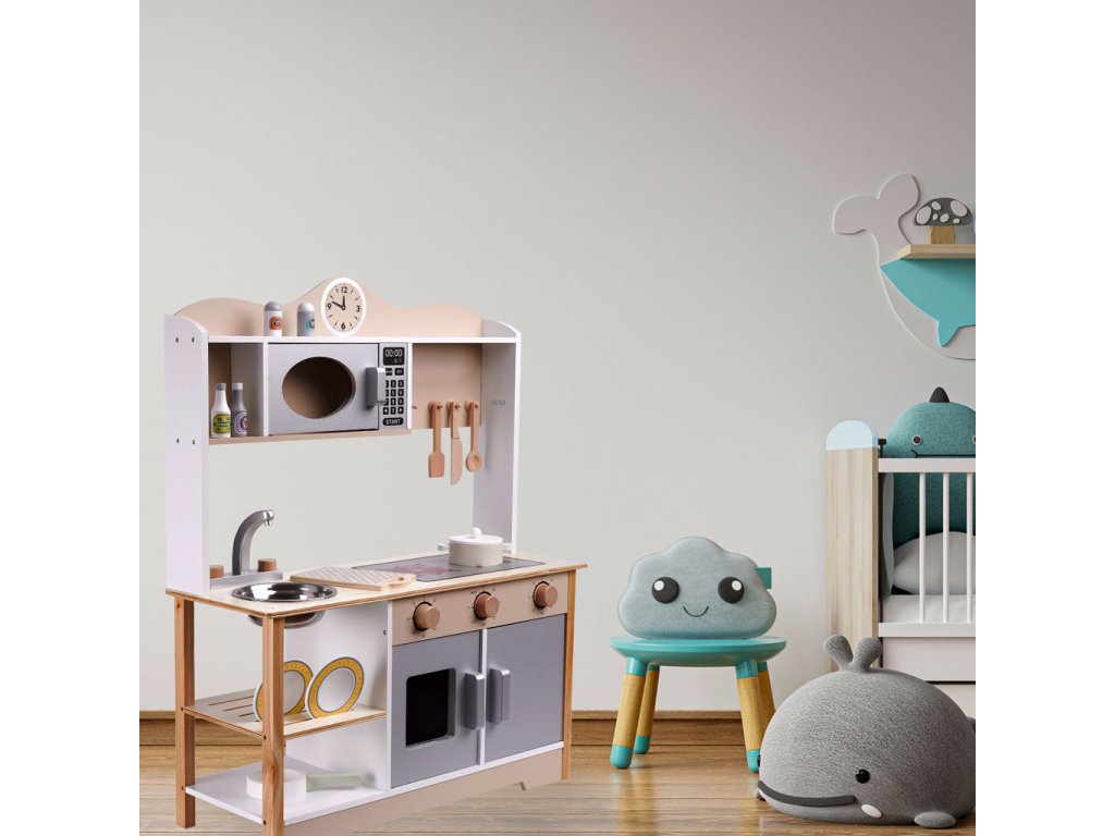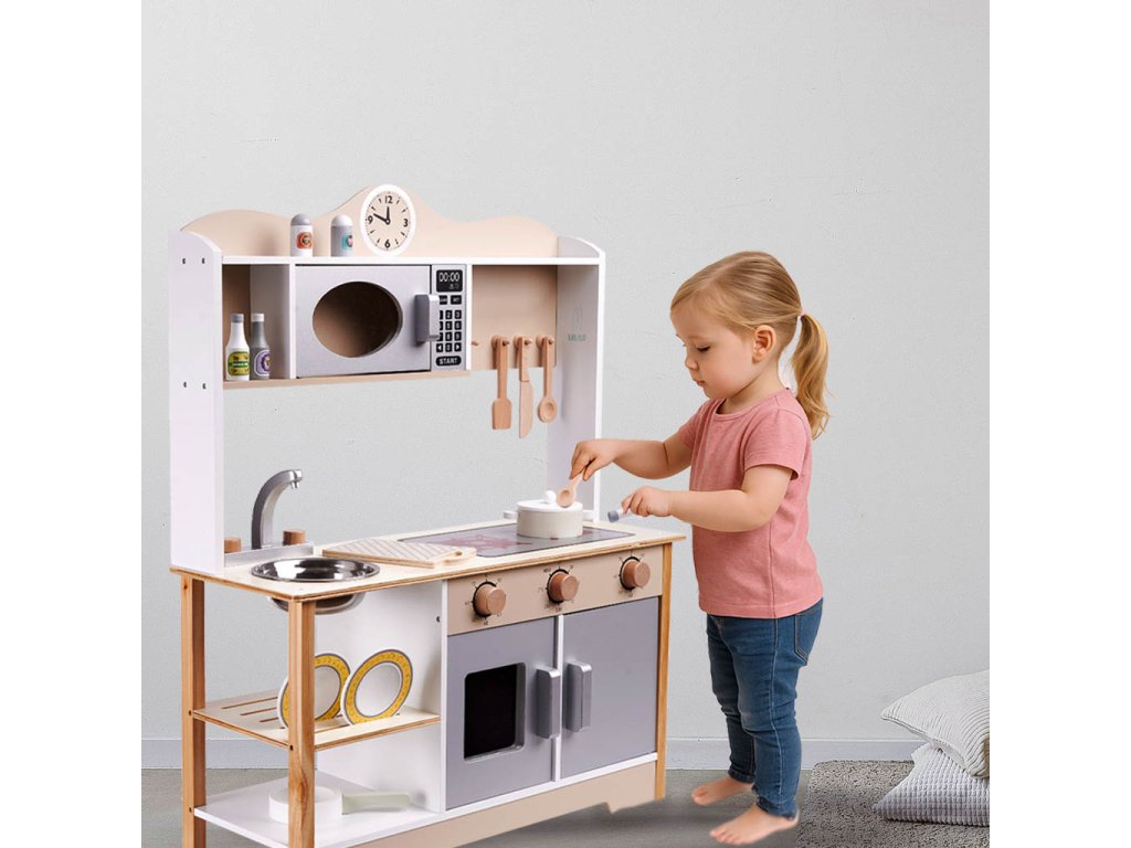 Má mnoho funkcí skutečné kuchyně a je vybavena dřezem, vodovodní baterií, sporákem, mikrovlnnou troubou, ale i policemi a skříňkami! Díky tomu bude v budoucnu mnohem snazší a zábavnější najít cestu do skutečné kuchyně.