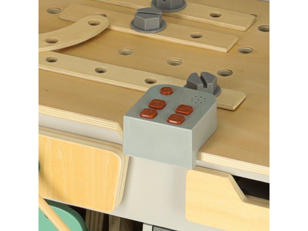 Dílna malého kutila s dálkovým ovládáním vydávajícím zvuky je ideálním místem pro hraní a učení. V bezpečném prostoru se batole naučí pojmenovávat a rozlišovat nástroje a také pravidla pro práci s nimi.
