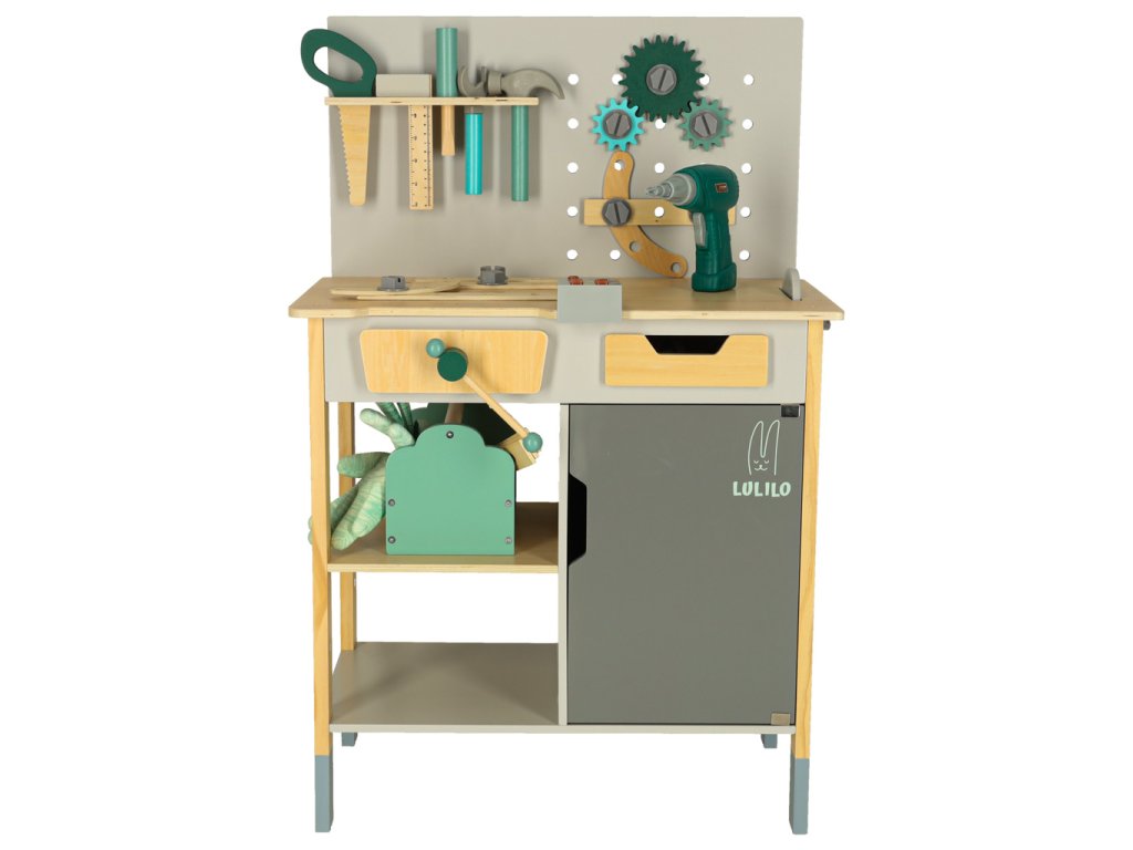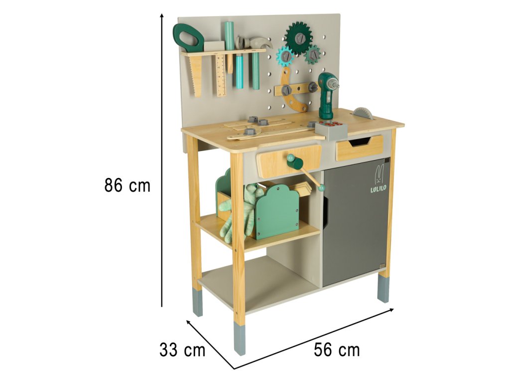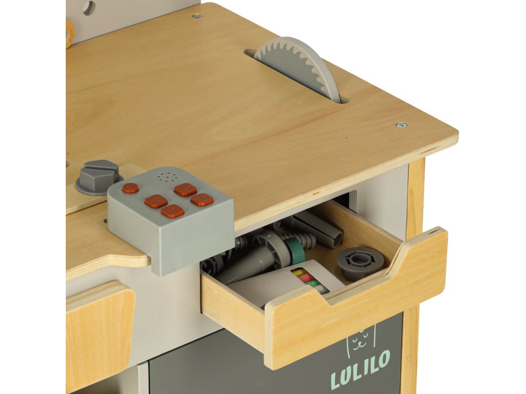 LULILO Fikso dřevěná dílna malá sada pro kutily s nářadím pila šroubovák zvuky 86cm