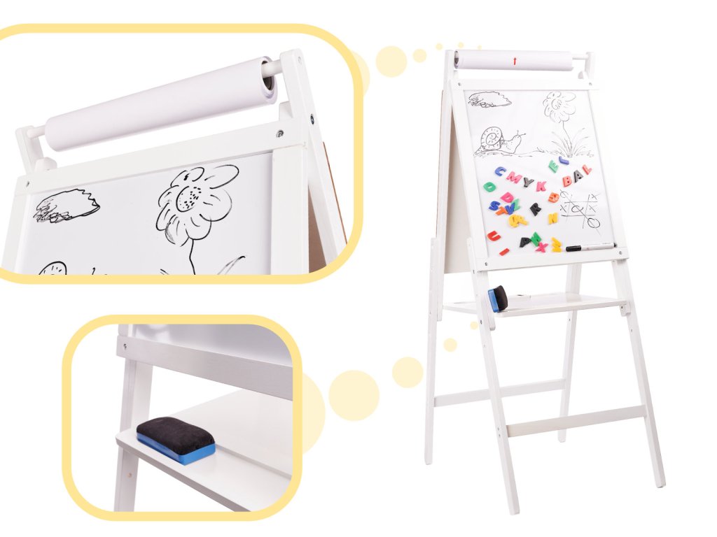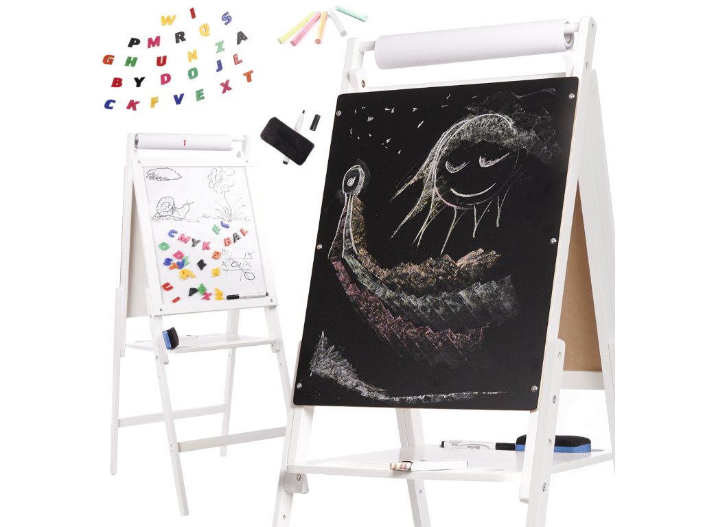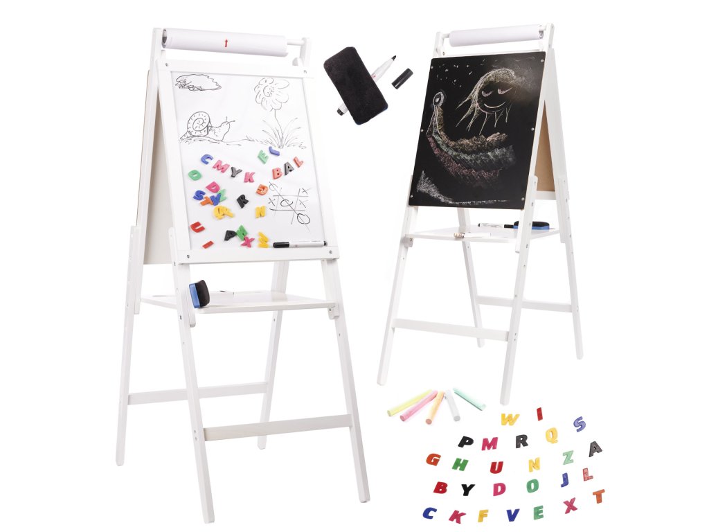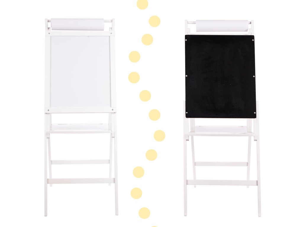 Bílá strana tabule je určena pro psaní nebo kreslení fixami a lze na ni připevnit i magnety. Po otočení na druhou stranu se objeví tabule.