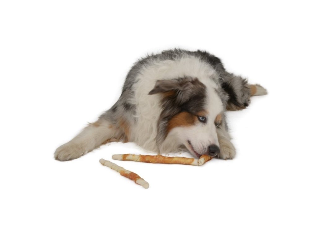 Přírodní masová pochoutka pro psy. Tyčka z hovězí kůže obtočená plátkem lahodného kuřecího masa. Slouží jako odměna při hře, výcviku nebo jako doplněk stravy při cestách. - 100% čisté kuřecí maso- tyčinky z hovězí kůže - velmi chutný- vhodný pro motivaci - nezatěžují organismus - dobře stravitelný - bez negativních účinků na zuby a dásně - uzavíratelnému Zipový uzávěr obaluSložení: kuřecí maso, hovězí kůže, glycerin, sorbitol, cukrAnalytické složky: hrubý protein 60%, hrubá vláknina 0,2%, hrubý tuk 3%, hrubý popel 3%, vlhkost max. 23%Doplňkové parametry