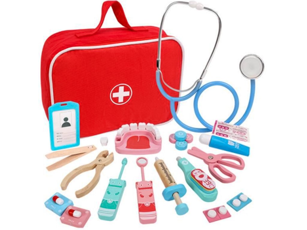 Sada pro malého lékaře, zubaře nebo záchranáře s dřevěnými doplňky.
