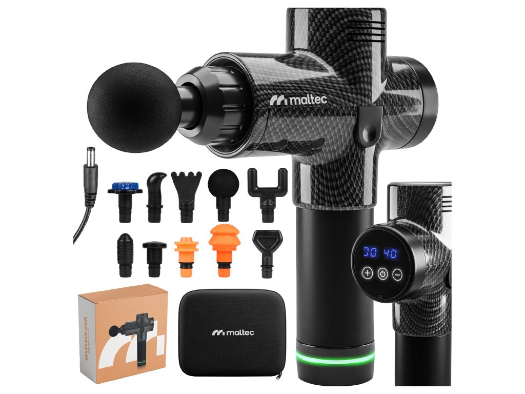 6152 30 rychlostí 1400-3200 ot/min Akumulátor: Li-Ion 2500mAh Doba nabíjení: 2-3h Doba používání: až 3-4h Pouzdro: ABS + silikon LCD displej Amplituda: 10mm Hmotnost masážní pistole: 870g Max hluk: 45dB V balení: 10 nástavců, kufřík, nabíječka