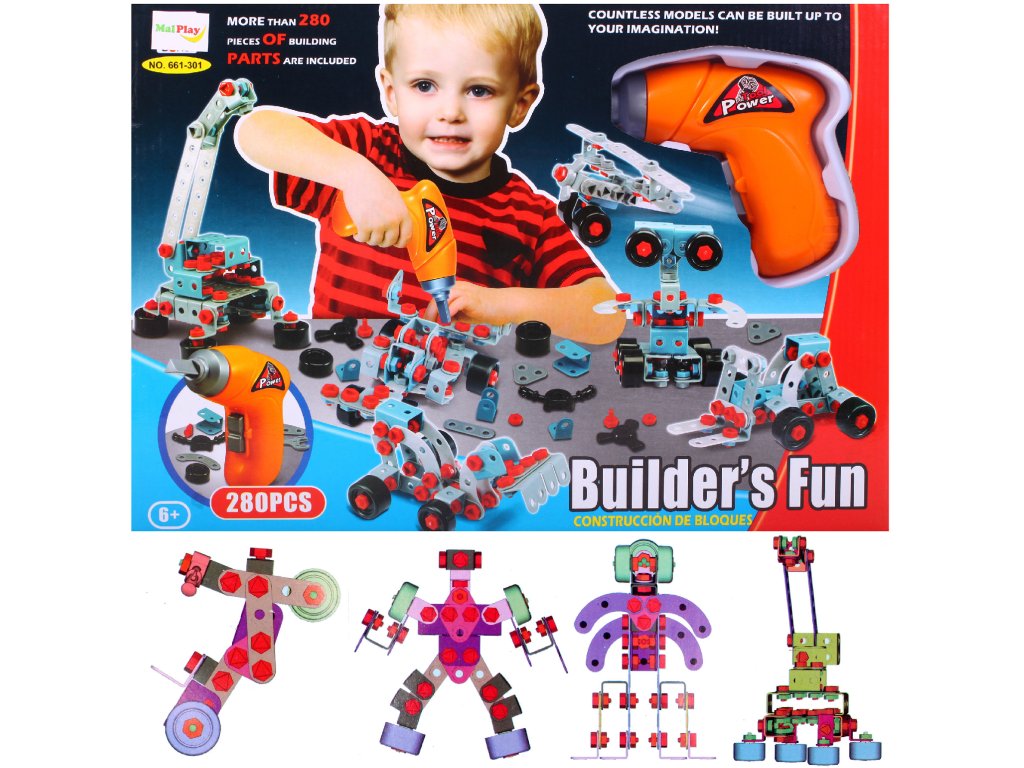 6092 101648 280 prvků, možnost postavit 10 různých konstrukcí, vrtačka na baterie 2 x AA - není součástí balení. Možné sestavy: ZVEDÁK, PLACHETNICE, MIMOZEMŠŤAN, ROBOT, JEŘÁB. Rozměry krabice 41 × 29 × 5,5 cm.