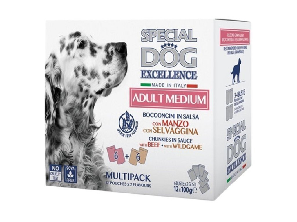 Lahodná receptura vyrobená v Itálii, bez barviv, konzervačních látek a přidaných cukrů. Special Dog Excellence je produktová řada navržená tak, aby vašemu psovi nabídla jen to nejlepší. Kompletní a vyvážená strava, speciálně sestavená tak, aby podporovala každodenní pohodu vašeho nohatého přítele a splňovala jeho nutriční potřeby. Výhodné multipack obsahující 12 kapsiček po 100 gramech s chutnými kousky v omáčce pro dospělé psy střední velikosti ve dvou různých příchutích: 6 x s hovězím masem: Složení: maso a vedlejší masné výrobky 45 % (z toho hovězí maso min. 5 %), vitamíny, minerální látky.Deklarované jakostní znaky: hrubé bílkoviny: 8,99 %, hrubé oleje a tuky: 5,98 %, hrubá vláknina: 0,5 %, hrubý popel: 1,76 %, vlhkost: 78,39 %.Výživové přísady/kg: Vitamín A 2000 UI, vitamín D3 200 UI, vitamín E 5 mg. Technologické přídavné látky: zahušťovadla a želírovací látky. 6 x zvěřina:Složení: maso a vedlejší masné výrobky 45 % (z toho zvěřina min. 6 %), vitamíny, minerální látky.Deklarované jakostní znaky: hrubé bílkoviny: 8,99 %, hrubé oleje a tuky: 5,98 %, hrubá vláknina: 0,5 %, hrubý popel: 1,76 %, vlhkost: 78,39 %.Výživové přísady/kg: Vitamín A 2000 UI, vitamín D3 200 UI, vitamín E 5 mg. Technologické přídavné látky: zahušťovadla a želírovací látky. Krmný návod pro psa střední velikosti: doporučené dávkování: 3-4 kapsičky denně. Podává se při pokojové teplotě. Zajistěte vždy čerstvou a čistou vodu. Po otevření nechte v chladničce po dobu max. 24 hodin.Doplňkové parametry