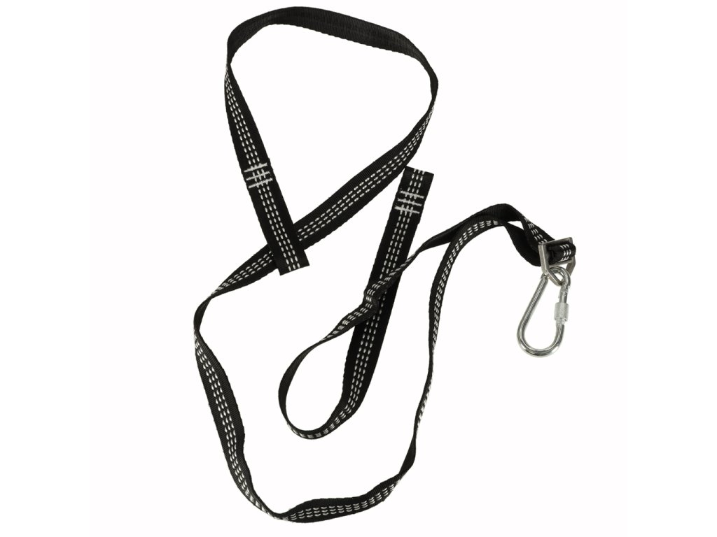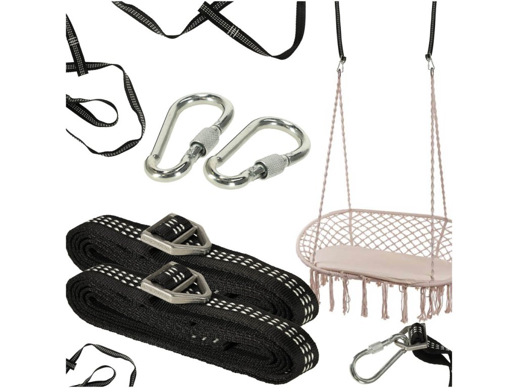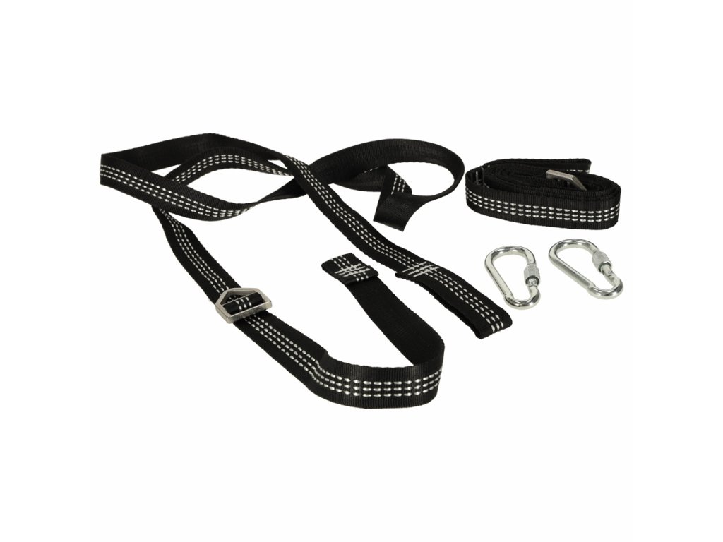 Sada obsahuje dva extrémně pevné popruhy o délce 2 m a dvě robustní karabiny, z nichž každá má maximální nosnost 300 kg. Můžete si tak být jisti, že zavěšené sedátko zůstane stabilní a bezpečné i při intenzivním používání.