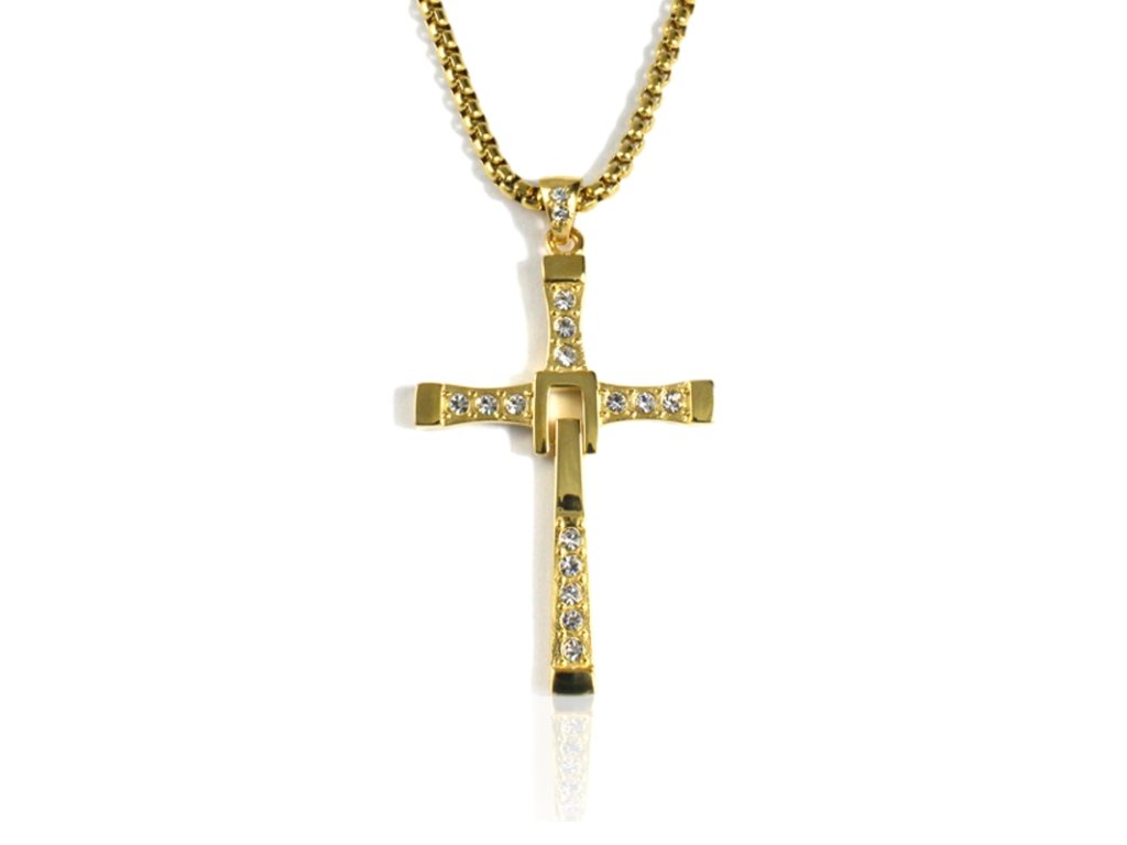 - zdobený pozlaceným přívěskem ve tvaru křížku ala Vin Diesel jako Dominic Toretto se zirkony,