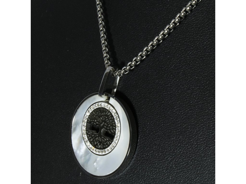- přívěšek ve tvaru stromu života a zdobí ho čirých zirkonů a imitaci perly,