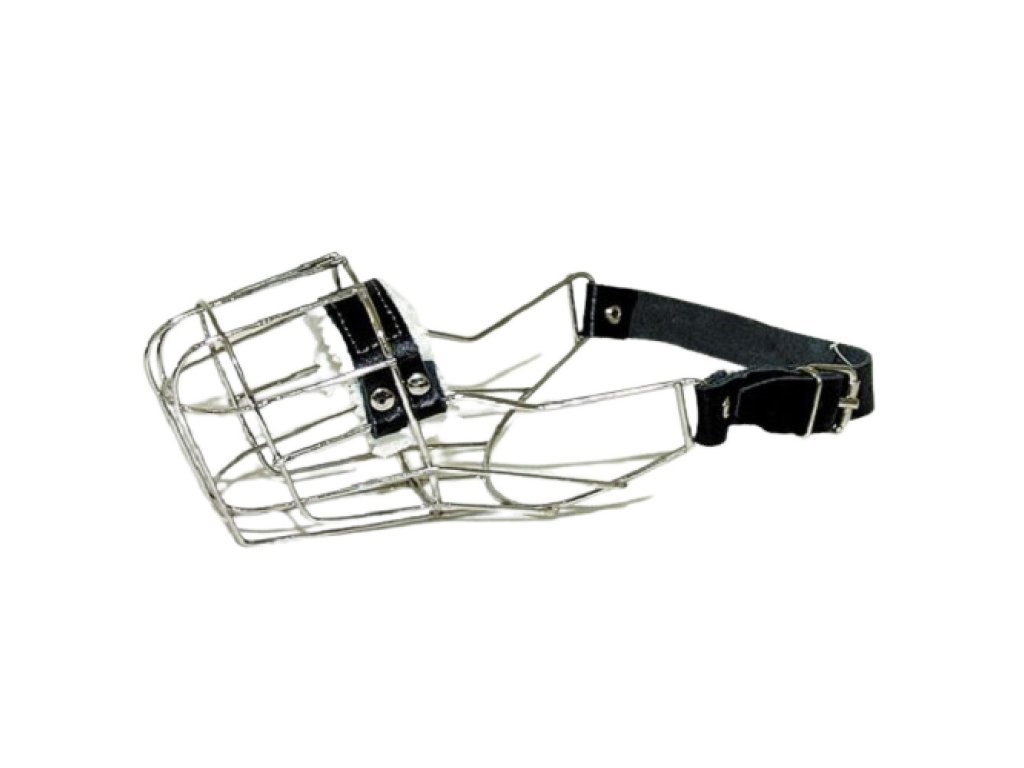 Kovový náhubek s koženými řemínky na zapínání pro fenu amerického staf. teriéra.