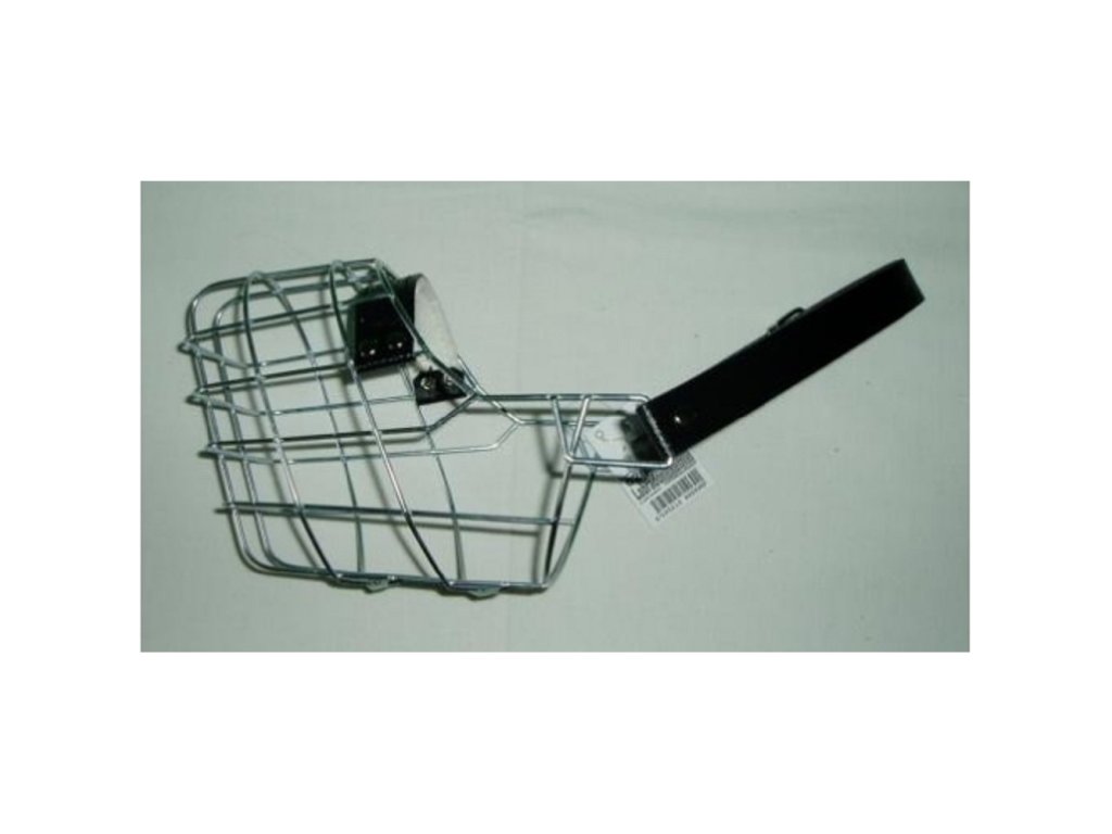 Kovový náhubek s koženými řemínky na zapínání pro fenu belgického ovčáka.