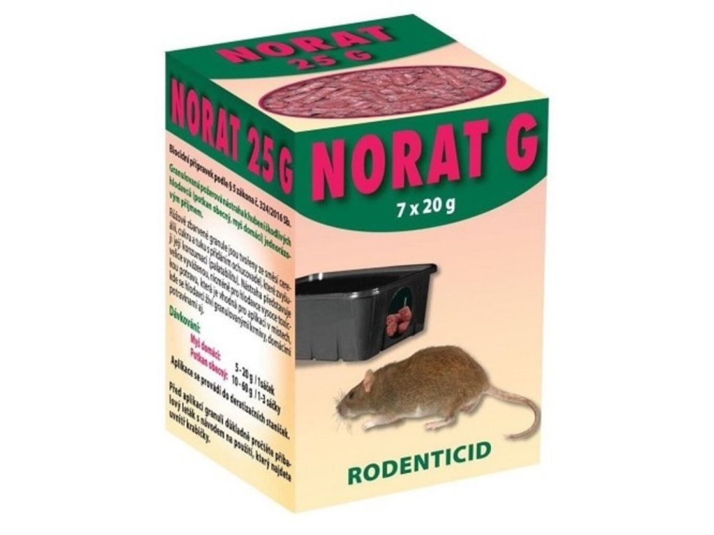 Norat je vysoce účinná granulovaná požerová nástraha pro hubení potkana, krysy a myši domácí v uzavřenych objektech nebo v jejich těsné blízkosti. Hubí všechny hlodavce jednorázovým příjmem při nízké aplikační dávce. hlodavci hynou za 3-10 dní po přijetí letální (smrtelné) dávky, která představuje pouze zlomek denního příjmu potravy hlodavců. Růžová nástraha na bázi vysoce traktivního materiálu obsaženého v granulích nevyvolává obranný reflex, smrt je způsobena vnitřním vykrvácením.Nástraha obsahuje hořké činidlo, které působí odpudivě pro člověka, zejména děti. Přípravek se stává bezpečnější a náhodná použití jsou tím značně minimalizována.Antikolagulant brodifacoum působí jednorázově a je účinný i na kmeny rezistentní k jiným rodenticidním látkám. Tou největší předností a výhodou rodenticidu NORAT je maximální deratizační efekt při minimální spotřebě nástrah.Doplňkové parametry