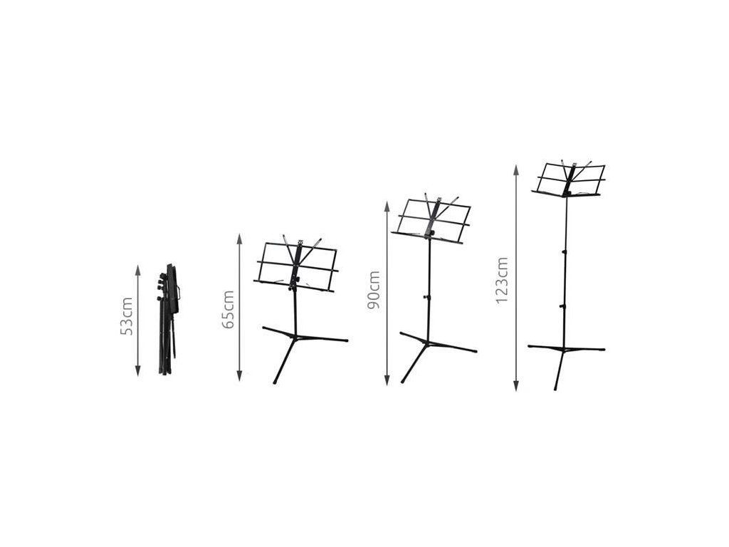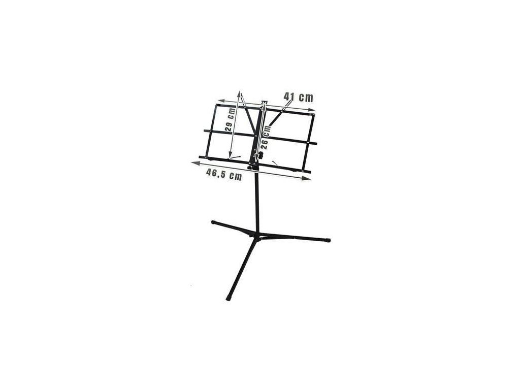Kovový hudební stojan s práškovým nástřikem. Má třínohou základnu a nastavitelnou výšku. Pracovní plocha je skládací. Stativ je doporučen jak pro profesionály, tak pro amatéry.