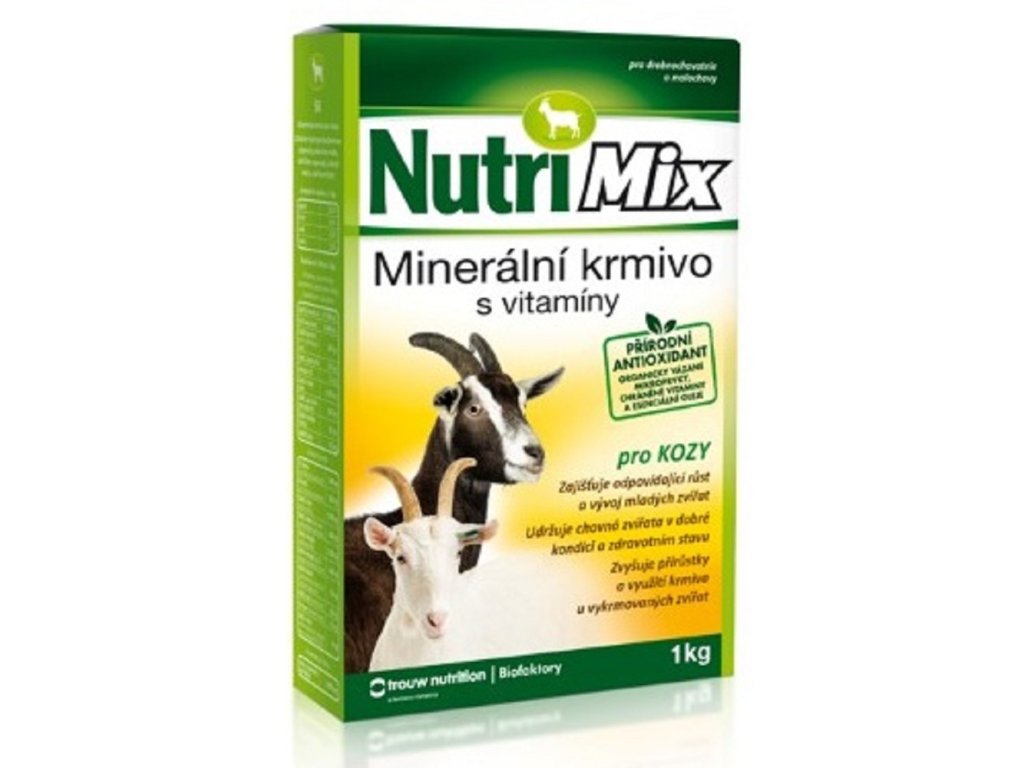 Denní doplnění minerálních látek a vitaminů. Zajišťuje odpovídající růst a vývoj mladých zvířat, udržuje chovná zvířata v dobré kondici a zdravotním stavu, zvyšuje přírůstky a využití krmiva u vykrmovaných zvířat, obsahuje měď a extra přídavek niacinamidu a biotinu, obsahuje organicky vázané mikroprvky pro lepší využitelnost, přírodní antioxidanty, chráněné vitaminy skupiny B na podporu energetického metabolismu a esenciální oleje na snížení produkce metanu v bachoru.Problém: nedostatečná nebo nevyvážená krmná dávka pro kozy v odchovu nebo ve výkrmu má za následek snížené přírůstky, nižší využitelnost krmiva, menší životaschopnost a horší zdravotní stav.Řešení: NutriMix pro kozy je určen na doplnění minerálních látek a potřebných vitaminů do krmných dávek zvířat chovaných v drobnochovech. Přispívá k udržení dobrého zdravotního stavu a životaschopnosti mláďat. Je určen ke každodennímu doplňování méně hodnotných krmiv.Způsob aplikace: odměřené množství přípravku se rovnoměrně zamíchá do krmné dávky (jádra) nebo se nasype do žlabu na píci. Na počátku odchovu a výkrmu je vhodné používat dolní hranici doporučeného dávkování a postupně zvyšovat podle rostoucí hmotnosti a stáří zvířat. Je nutné zajistit trvalý přístup k zdravotně nezávadné vodě. Dávkování: Kůzlata 5 - 10 g/ 1 kus/ den (1 vrchovatá čajová lžička)Dospělá zvířata 10 - 20 g/ 1 kus/ den (2 - 3 vrchovaté čajové lžičky)Březí a laktující samice 15 - 30 g/ 1 kus/ den (2,5 - 4 vrchovaté čajové lžičky)(1 plná čajová lžíce - cca 10 g)Složení v 1 kg: vápník 155 g, fosfor 65 g, sodík 55 g, hořčík 25 g, vitamin A 477 500 m.j., vitamin D3 55 000 m.j., vitamin E 300 mg, niacinamid 3 000 mg, biotin 60 mg, železo 690 mg, měď 600 mg, zinek 3 000 mg (z toho organická vazba 600 mg), mangan 1 500 mg (z toho organická vazba 300 mg), jod 60 mg, kobalt 20 mg, selen 15 mg (z toho organická vazba 4 mg), přírodní antioxidant 300 mg, esenciální oleje 2600 mg.Doplňkové parametry