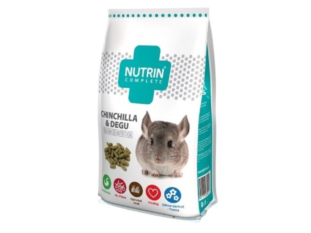 Složení: vojtěška, pšenice, lignocelulosová vláknina, kukuřice, ovesná vláknina, kvasnice (Saccharomyces cerevisiae), hrachový protein, petržel, monokalciumfosfát, chlorid sodný, jablečná vláknina, heřmánek, jitrocel, přeslička, třezalka, máta, slunečnicový olej, hroznové výlisky, uhličitan vápenatý, cukrovarské řízky, FOS - čekankový inulin 2 g/kg, slunečnicové slupky, Yucca schidigera 1 g/kg, jablečné výlisky.Analytické složky: Hrubý protein 15 %, hrubá vláknina 19 %, hrubé oleje a tuky 3 %, obsah anorganických látek 7 %, Ca 0,9 %, P 0,6 %.Doplňkové látky/kg: Vitaminy: Vit A (3a672a) 6 000 m.j., vit D3 (3a671) 1 100 m.j., vit C (3a300) 100 mg, vit E (3a700) 40 mg, Cholinchlorid 200 mg, Niacinamid 22 mg, vit B2 16 mg, vit B6 16 mg, vit B5 10 mg, vit B1 5 mg, vit K3 0,9 mg, vit Biotin 0,27 mg, vit B12 0,02 mg. Stopové prvky: Mn (3b506) 60 mg, Zn (3b607) 40 mg, Cu (3b406) 6 mg, Fe (3b106) 5 mg, I (3b202) 0,75 mg, Co (3b305) 0,3 mg, Se (3b8.11) 0,3 mg. Aminokyseliny: L-lysin (3.2.3.) 6 g, DL-methionin (3c301) 2 g. Emulgátory: Lecitin (E 322) 5 g. Antioxidanty: rozmarýnový extrakt a přírodní tokoferoly.Krmný návod: krmivo Nutrin Complete Chinchilla & Degu, je určeno pro činčily a osmáky. V případě, že toto krmivo podáváte poprvé, změna krmiva by měla proběhnout postupně. V praxi se jedná o pozvolné navyšování krmiva Nutrin na úkor krmiva původního. Nahrazování původního krmiva by mělo proběhnout postupně, především z hlediska prevence zažívacích potíží a také proto, že zvíře ne vždy nové krmivo okamžitě akceptuje. Délka období se tak může lišit od několika dnů až po několik týdnů.Krmná dávka by se od začátku měla řídit doporučenou denní dávkou krmiva Nutrin Complete Chinchilla & Degu, tedy 4 - 6 g na 100 g tělesné hmotnosti. Denní množství je vhodné rozdělit a podávat ráno a večer. Vždy zajistěte neomezený přístup k senu a čerstvé vodě. V případě, že zvíře pravidelně nekonzumuje vše nebo není pozorován úbytek sena, je vhodné denní dávku snížit. Zpestření ve formě zeleného krmiva, čerstvého ovoce, zeleniny a ohryzu je možné. Veškeré změny, týkající se krmné dávky, by měly být prováděny s ohledem na tělesnou hmotnost, kondici a zdravotní stav jedince.Doplňkové parametry