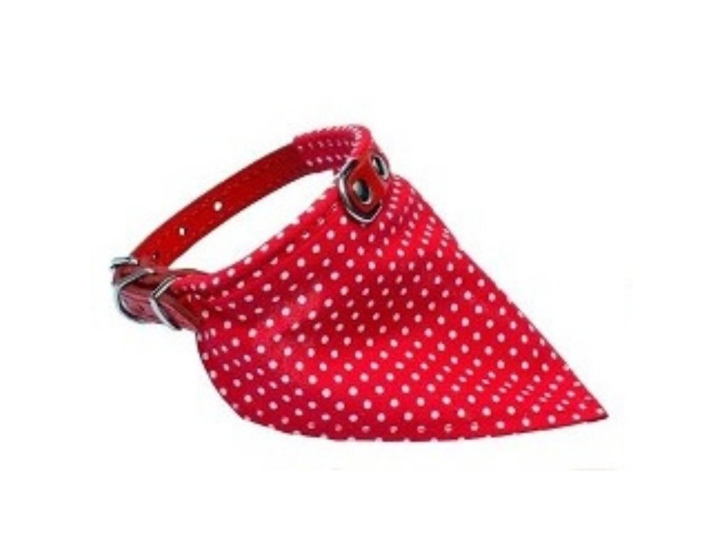 Kožený obojek pro psy zdobený bavlněným šátkem.Rozměr: 1 x 26cm Barva obojku: červenáBarva a vzor šátku: červená/puntíkDoplňkové parametry