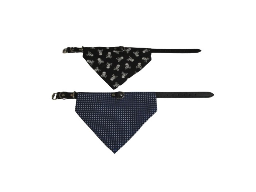 Kožený obojek pro psy zdobený bavlněným šátkem.Rozměr: 1,6 x 40cmBarva obojku: černáBarva a vzor šátku: viz foto Zasíláme barvu dle aktuální skladové zásoby. Pokud však požadujete výhradně jednu z barev, veďte to prosím v poli "poznámka".Doplňkové parametry