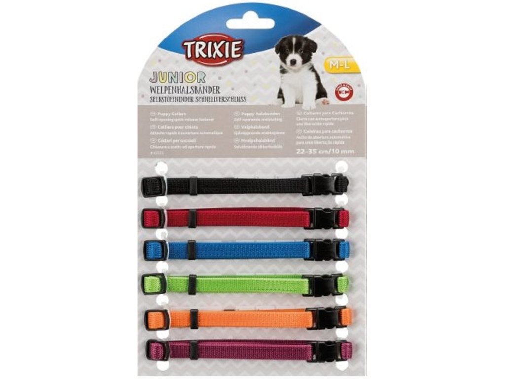Obojky s cílem pomoci chovateli odlišit štěňátka z vrhu, Trixie nabízí speciální sadu štěněcích obojků s bezpečnostním zapínáním. Štěně, které vyrůstá s obojkem nepotřebujete extra navykání na obojky později.Rozměr: 1,0 x 22 - 35cmV balení: 6ksDoplňkové parametry