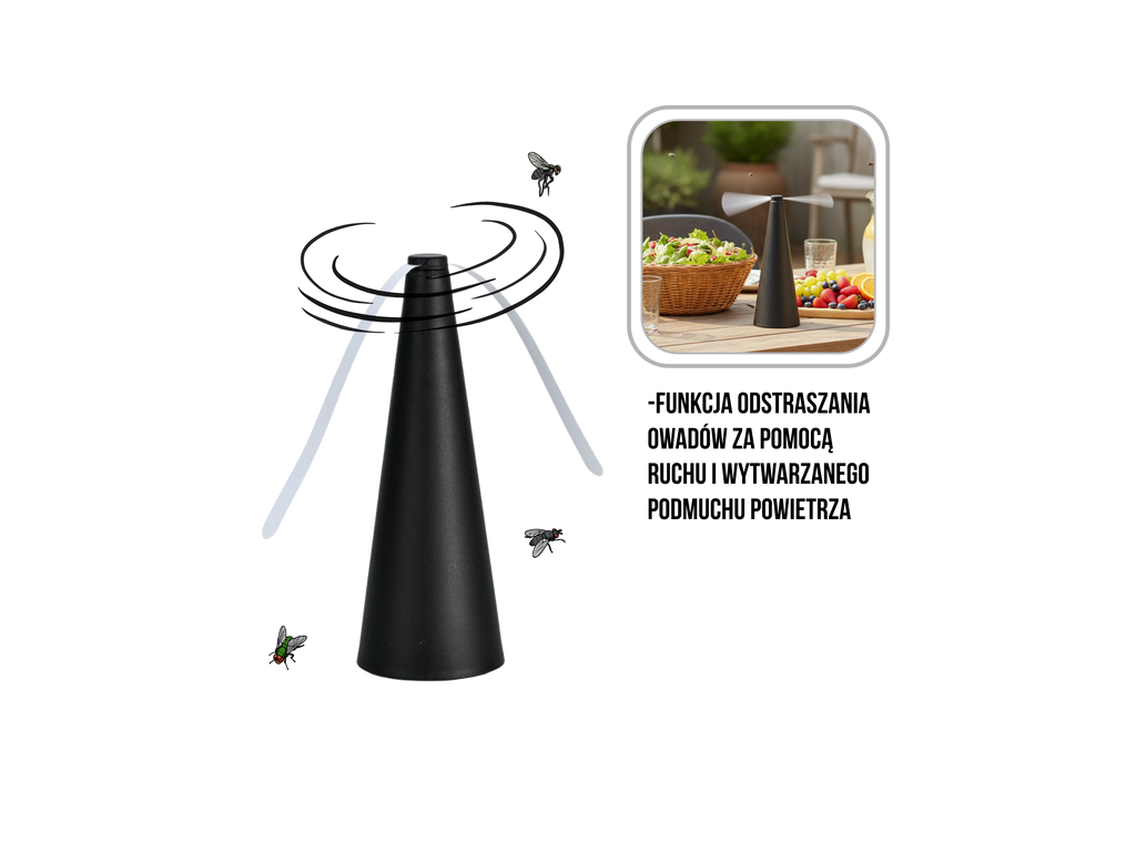— Odpuzuje mouchy, vosy a další hmyz díky rotujícím lopatkám. — Vytváří jemné, nepravidelné pohyby, které odrazují hmyz od přibližování k jídlu. — Stabilní základna umožňuje umístit zařízení na stůl nebo pracovní desku. — Funguje bez chemikálií: zcela bezpečné pro lidi, zvířata a potraviny. — Tichý provoz: neruší rozhovory ani odpočinek. — Měkké lopatky: bezpečné pro děti a zvířata, zastaví se po lehkém doteku. — Napájení: 2 baterie AA (nejsou součástí balení). — Rozpětí lopatek: cca 40 cm.Doplňkové parametry
