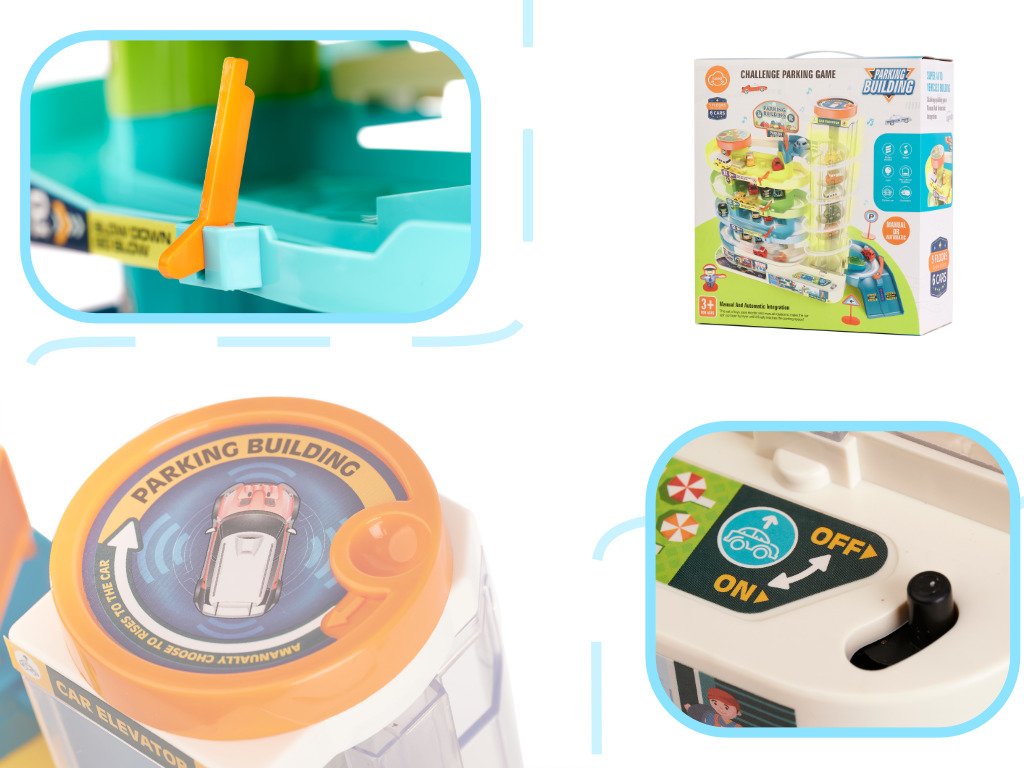 Parkoviště má až 4 úrovně, které jsou určeny pro parkování automobilů, které najdete v sadě. Auta se nahoru dostanou pomocí automatického výtahu.
