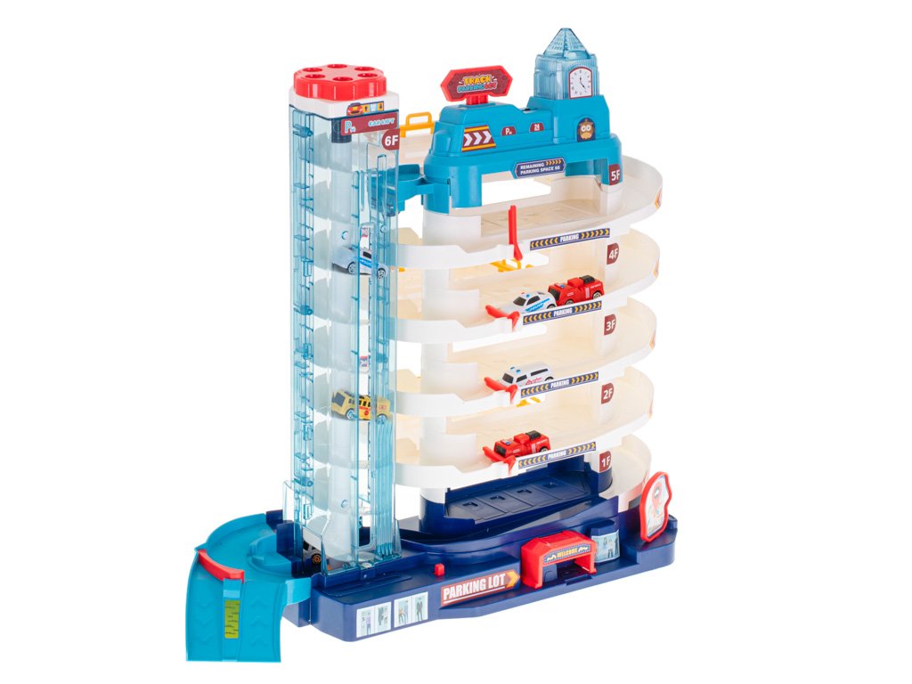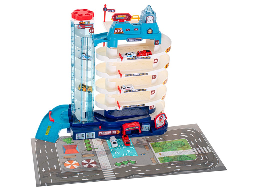 Parkoviště má až 5 úrovní, které jsou určeny pro parkování automobilů, které najdete v sadě. Auta se nahoru dostanou pomocí automatického výtahu.