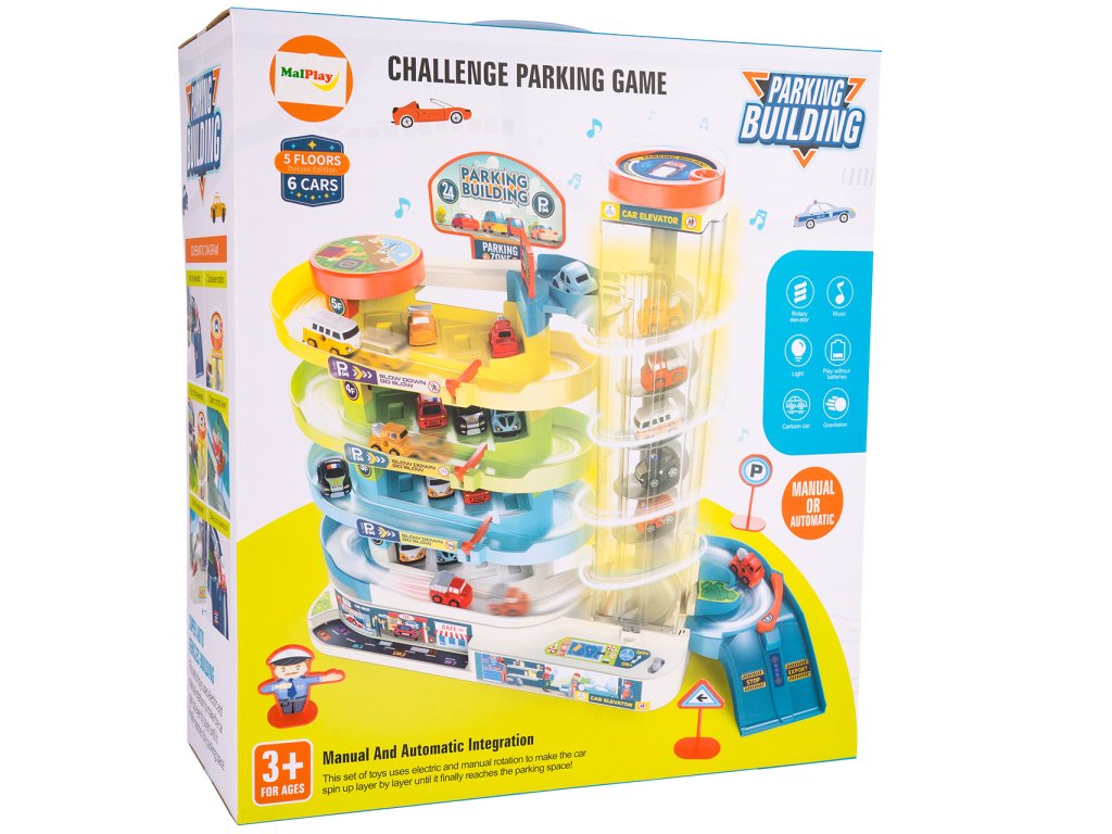 Parkoviště 5 úrovní + 6 autíček Rozměry produktu: 33 x 13,5 x 30,5 cm Rozměry autíčka: 3,5 cm x 2 cm x 2 cm Rozměry balení: 34 x 31 x 14 cm Napájení (volitelné): 3xAA (nejsou součástí balení) Materiál: plast Věk: od 3 letDoplňkové parametry