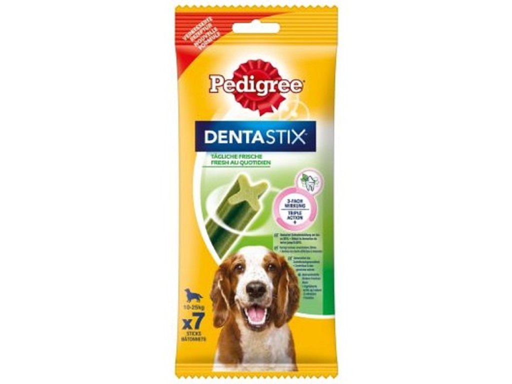 Pohodlné řešení zubní hygieny Vašeho psa. I u psů je důležité každodenně se starat o čistotu chrupu. Pedigree Denta Stix Fresh čistí zuby a udržují zdravé dásně. Díky obsahu eukalyptu a extraktu ze zeleného čaje (bez obsahu kofeinu) se zmenšuje zápach ze psí tlamy. Podle klinických testů se při pravidelném používání Pedigree Denta Stix Fresh může omezit vznik zubního kamene až o 80%. Hlavní zásluhu na tom má speciální textura a obsah aktivních účinných látek.Složení: cereálie, výrobky rostlinného původu (včetně 0,2% extraktu z bezkofeinového zeleného čaje a 0,0,% eukalyptového oleje), minerální látky (včetně 2,3% tripolyfosfátu sodného), maso a výrobky živočišného původu, oleje a tuky.Deklarované jakostní znaky: proteiny 7,7%, tuk 1,3%, vláknina 2.8%, popel 5,4%, hrubá vláknina 0,70%, vlhkost 16,2%, energie 308kcal/100g.Doplňkové parametry