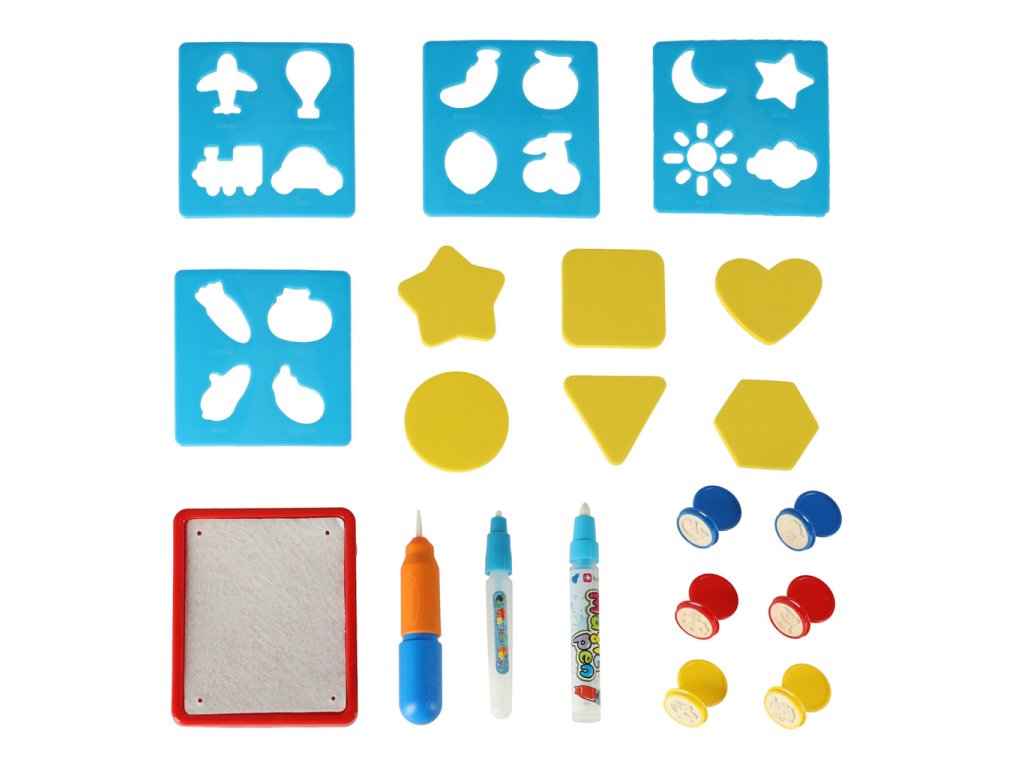Když ji namočíte vodou, na podložce se objeví barevný obrázek. Pomocí přiložených šablon můžete na jeho povrch obkreslovat různé tvary. Kromě toho existují razítka, která lze po namočení do vody otisknout na povrch.
