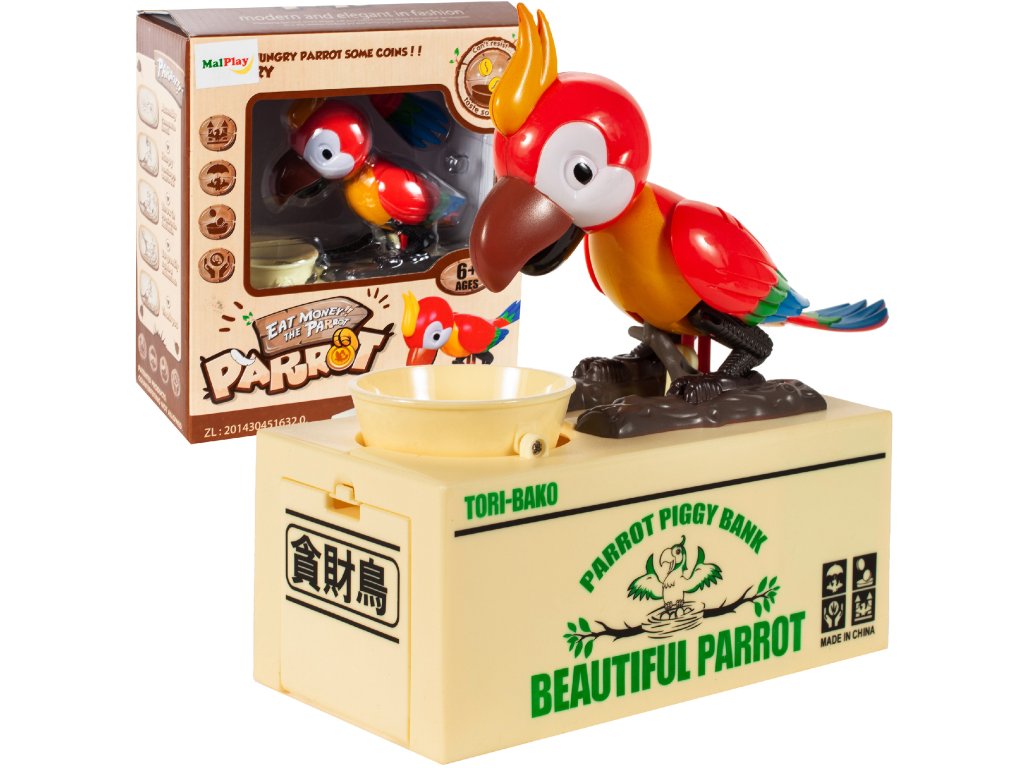 Elektronický papoušek požírající mince - pokladnička. Má pohyblivé končetiny.