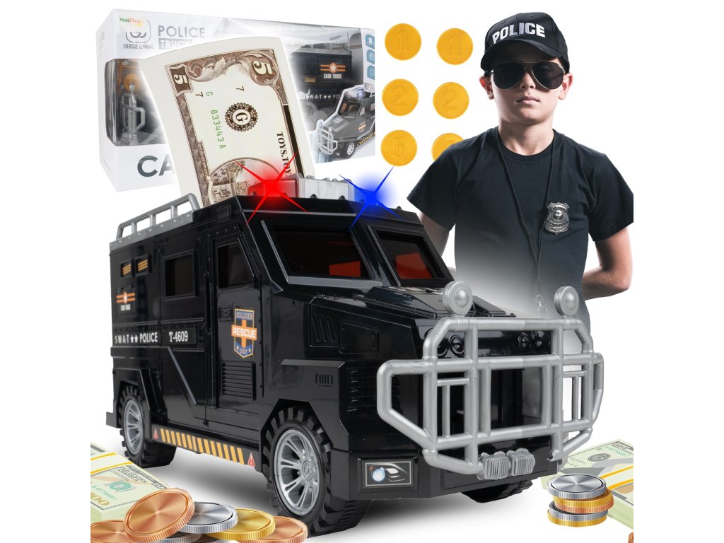 Pokladnička sejf auto policie SWAT nabízí úložný prostor ve tvaru policejního auta. Rozměry auta: délka 32 cm x šířka 12,5 cm x výška 16 cm. Napájení je zajištěno třemi bateriemi AA (nejsou součástí balení). Výrobní PIN kód: ANO. Možnost změny kódu: ANO. Obsahuje světelné a zvukové efekty. Rozměry balení: 37 cm x 18,5 cm x 15 cm. Vhodné pro děti od 3 let.