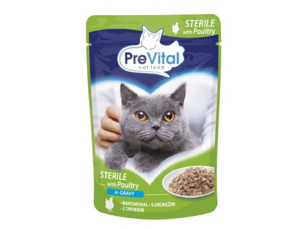 100% vyvážené krmivo pro kočky pro každou životní etapu, od juniorské kočky až po senior. Každý produkt PreVital obsahuje požadované vitamíny a minerály, aby byly zajištěny vyvážené a šťastné dny pro vaši kočku. Složení: deriváty masa a zvířat (4% drůbeží), vedlejší výrobky rostlinného původu (0,4% Inulin), minerální látky. Bez konzervantů. Analytické složky: vlhkost 82%, hrubý protein 8,5%, hrubý tuk 3%, hrubý popel 2,5%, hrubá vláknina 1%Nutriční přísady / kg: Vitamín D3 160IU, Vitamín E 30mg, Zinek (jako síran zinečnatý, monohydrát) 10mg, Mangan (jako oxid mangan (II) 2mg, Měď (jako měď (II) sulfát, pentahydrát) 1,2mg, Jód (jako jod vápník, bezvodý) 0,2mg, Taurin 520mg. Průvodce: Tyto pokyny jsou pouze orientační. Požadavky jednotlivých koček se mohou lišit od této příručky podle např. věku, plemene, tělesného stavu a úrovně aktivity. Průměrná velikost kočky 3 až 6kg potřebuje 265 až 420g jídla denně, nejlépe rozdělené na 2 jídla. Zpočátku krmte denní množství výše a poté se postupně přizpůsobujte, abyste udrželi svou kočku v dobré kondici.Doplňkové parametry