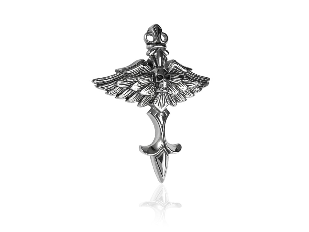 - přívěšek ve tvaru kříže s křídly a lebkou,