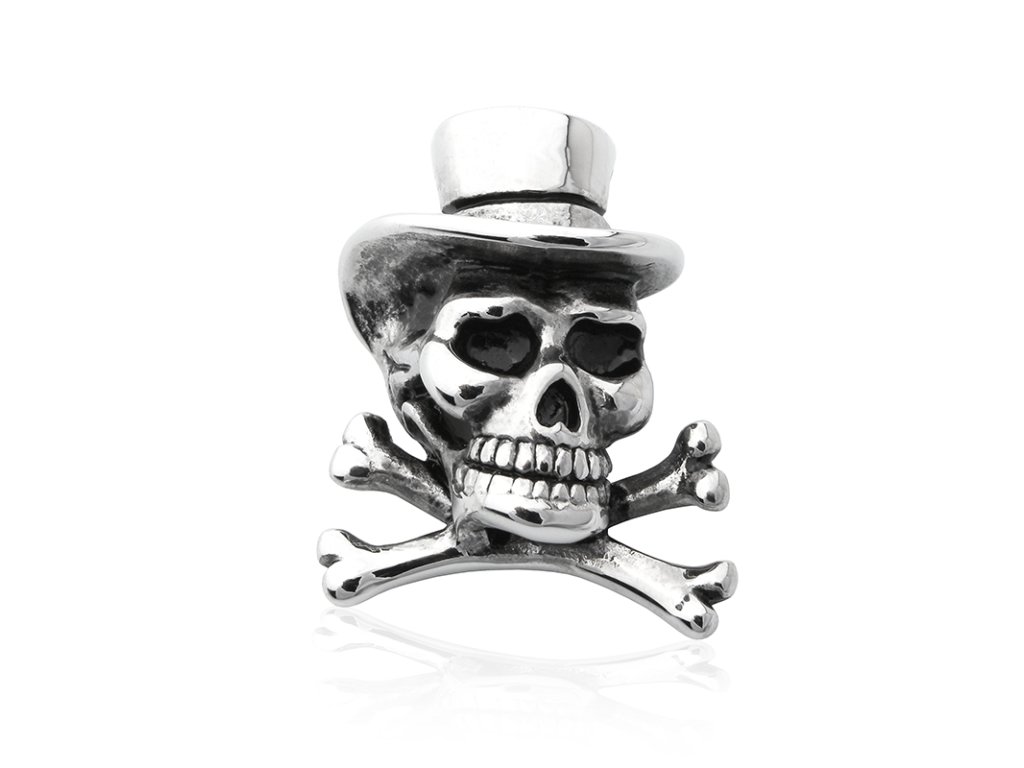 - přívěsek ve tvaru lebky se zkříženými kostmi a kloboukem,