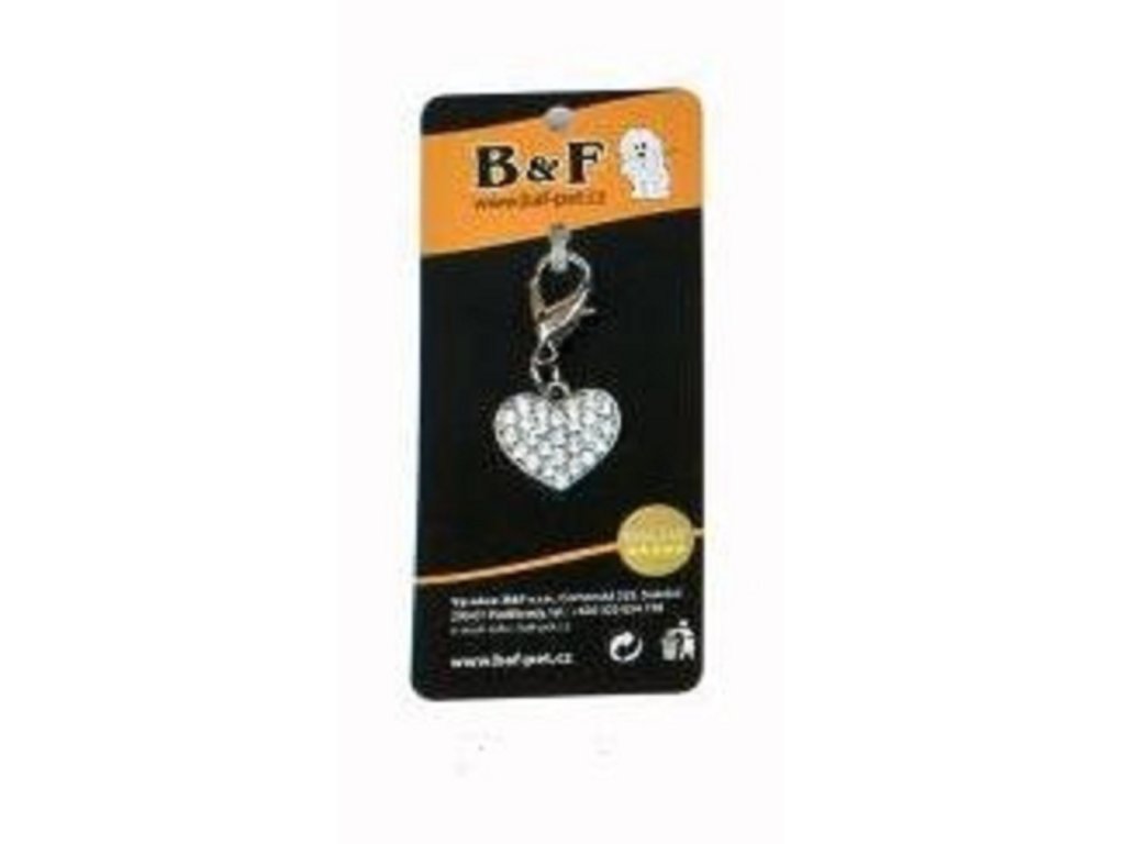 Přívěšek ve tvaru srdíčka, zdobený štravovými kamínky. Ozdoba určena na obojek, nebo kamkoli budete chtít.Je vyroben z kvalitního materiálu, neobsahuje nikl. K zamezení nežádoucích změn (vypadávání kamenů, změny barvy kovu, zbarvení srsti), docílíte tím, že přívěšek nepříjde do kontaktu s vodou.Rozměr: 2 cmBarva kamenů: stříbrná-bíláVnitřní průměr očka: 5 mmDoplňkové parametry