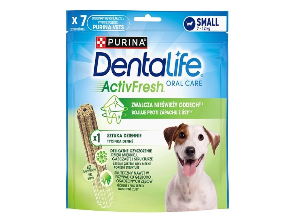 Purina Dentalife small je dentální pamlsek k čištění i špatně dostupných zadních zubů. Tato dentální pochoutka vyniká tím, že pomáhá psům čistit i špatně dostupné zadní zuby, omezuje tvorbu zubního kamene, osvěží dech a zároveň má nízký obsah tuku. Svěží dech je výsledkem neutralizace bakterií za pomoci přírodní spiruliny a medu. Pamlsek má speciální měkčí pórovitou texturu, která při žvýkání šetrně masíruje dásně psa. Obsahuje vitamín D a vápník. Bez obsahu aktivních chemických látek, bez umělých barviv a aromat.Složení: obiloviny*, glycerol, minerální látky, vedlejší výrobky rostlinného původu, med (1,1 %), oleje a tuky, maso a výrobky živočišného původu (1,1% kuře), sirup ze spiruliny, spirulina* (0,21 %). Krmný návod: Pro malého psa o hmotností od 7 kg do 12 kg 1 tyčinka denně. Čistá čerstvá pitná voda by měla být vždy k dispozici. Dohlížejte na svého psa během podávání pochoutky. Pro zdraví vašeho psa dodržujte krmný návod.*Přírodní suroviny. Analytické složky: protein 5,5%, tuk 2,5%, popel 5,0%, vláknina 1,5%, vápník 0,9%, vlhkost 14,5%Doplňkové parametry