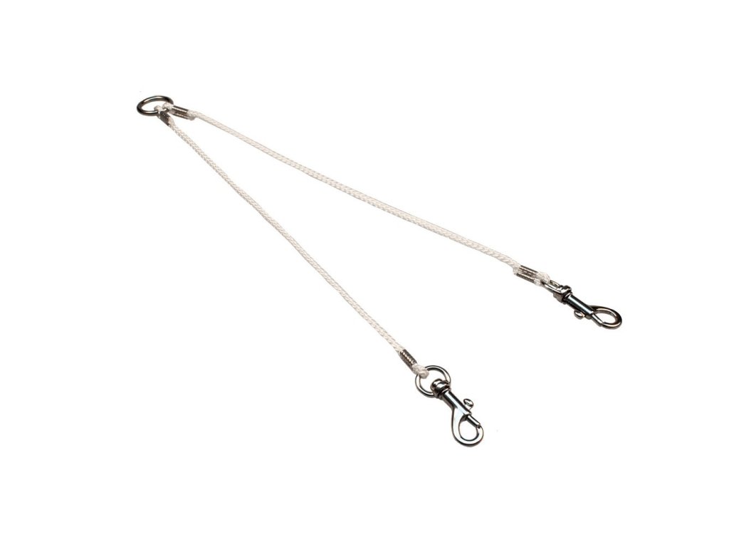 Nylonová rozdvojka pro psy malých plemen, opatřená pochromovaným kroužkem pro zaháknutí karabiny vodítka. Spoje lana u karabiny jsou svařeny a zpevněny kovovou sponou. Dvě hákové kované pochromované karabiny pro připevnění k obojkům psů. Délka rozdvojky: 2 x 30cmPrůměr lana: 0,3 mmBarva: bíláDoplňkové parametry