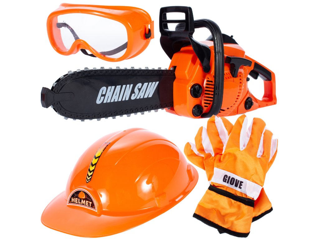 Sada dřevorubce pila, rukavice, přilba, brýle