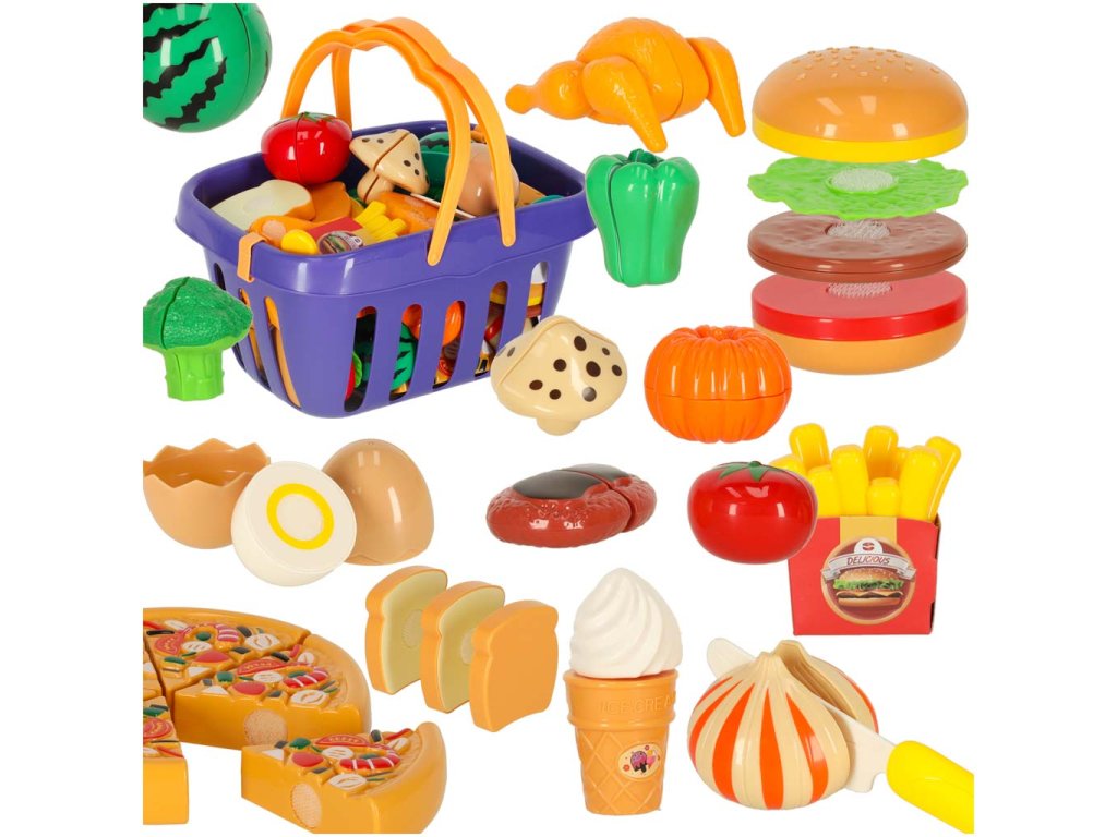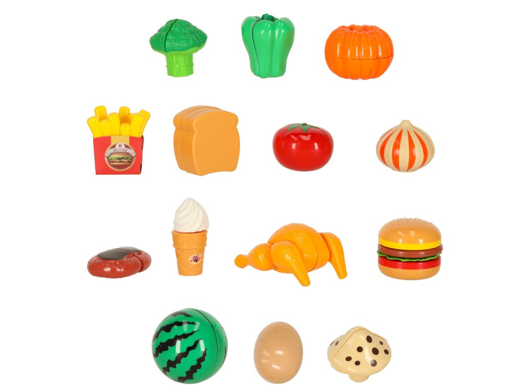 Potraviny (pizza, kuře, paprika, maso, rajče, meloun, toast, dýně, led, hranolky, houby, vejce, brokolice)