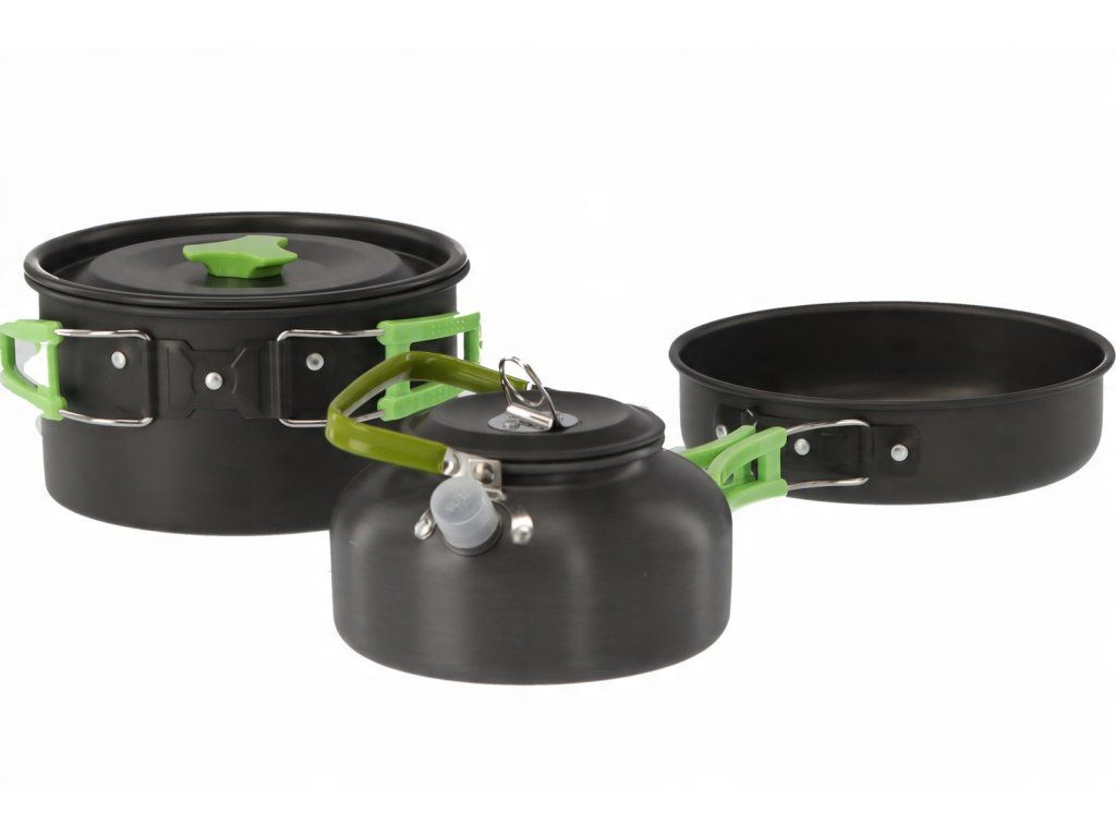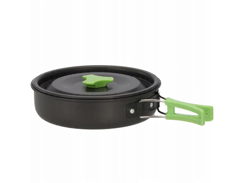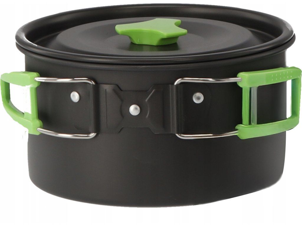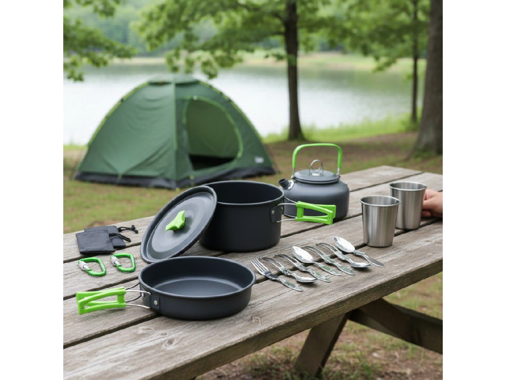 Obsahuje vše, co potřebujete k přípravě a konzumaci jídel v přírodě – od hrnce a konvice, přes pánev, po sadu příborů a hrnků. Skládací rukojeti, nepřilnavý povrch a pohodlné pouzdro zaručují komfort! 🎒✅