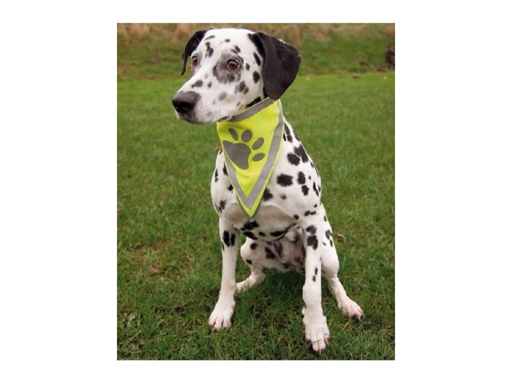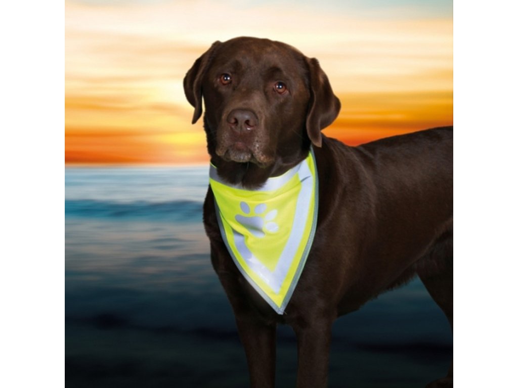 Úžasný bezpečnostní šátek pro každého pejska. Je vyroben z výrazně žlutého polyesteru, je ozdoben reflexními pruhy a tlapkou. Tím je zaručena perfektní viditelnost psa ve dne i v noci a současně. Užijte si svobodné procházky - i za tmy bude Váš čtyřnohý přítel na dálku vidět. Obvod krku: 29 - 42cmPraní: při teplotě do 30 °CDoplňkové parametry