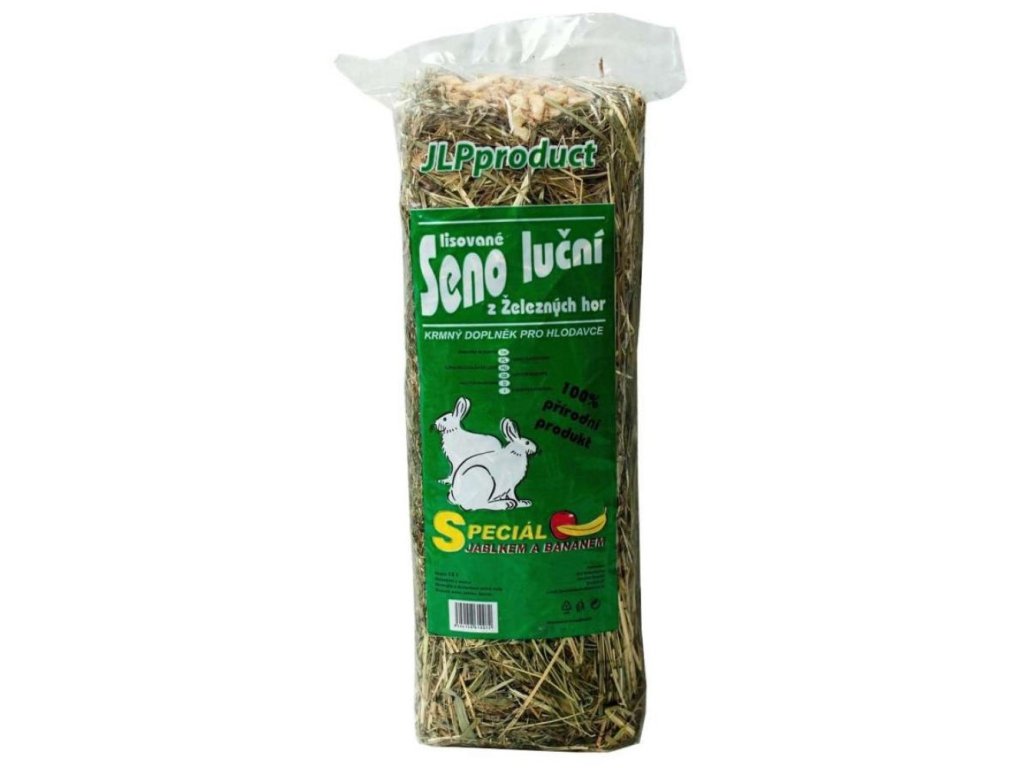 100% přírodní produkt. Vyrobeno ze sena výborné jakosti z luk plné bylin v Železných horách.Složení: seno luční, jetel luční, pampeliška, jitrocel kopinatý, jetel plazivý, pcháč různolistý, bojínek luční, a jiné.Přídavek: sušený banán, sušené jablko.- banány jsou bohaté na sacharidy, bohaté na vitaminy A, C a vitaminy skupiny B.- jablko je bohaté na taniny, látky, které mají stahující a protizánětlivé účinky.Doplňkové parametry