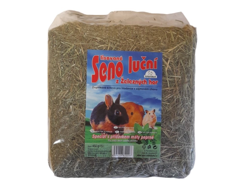 Vyrobeno ze sena výborné jakosti z luk plné bylin v Železných horách. Složení: Seno luční, jetel luční, pampeliška, jitrocel kopinatý, jetel plazivý, pcháč různolistý, bojínek luční, a jiné.Přídavek: Sušená máta peprná.- Mentol se vnitřně užívá při poruchách trávicího traktu (nadýmání, křeče, koliky), povzbuzuje chuť k jídlu, ovlivňuje tvorbu a vylučování žluče, příznivě působí při léčbě horních cest dýchacích.Doplňkové parametry