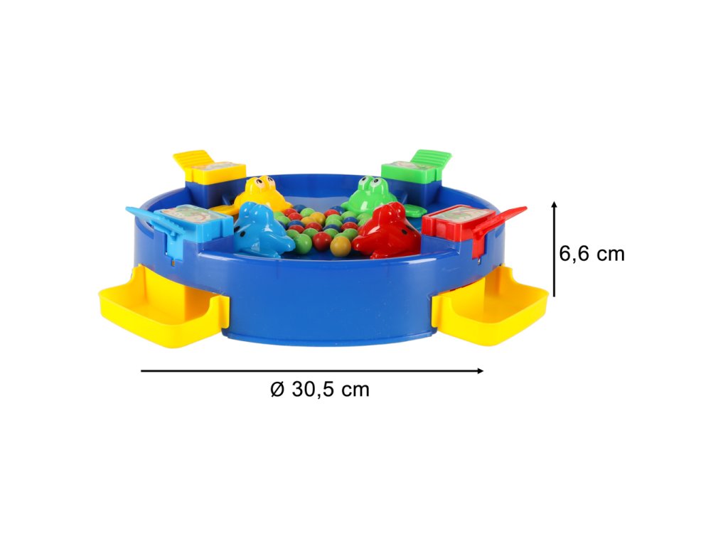 A v čem spočívá zábava? Její pravidla jsou snadno pochopitelná - každý hráč si vybere jednu žábu, pak je třeba nasypat kuličky doprostřed hrací plochy a stisknutím listů se jich snažit chytit co nejvíce! Až budou všechny kuličky posbírány, spočítejte je - vyhrává ten, kdo jich má nejvíc.