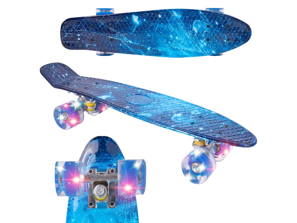 Protiskluzová mřížka. Kaučuková svítící kola 60x45mm s LED diodami. Deska 56x15cm z tvrdého, odolného materiálu. Ložiska ABEC-7. Rozměry desky: 56x15cm. Hmotnost uživatele: do 100kg.Doplňkové parametry