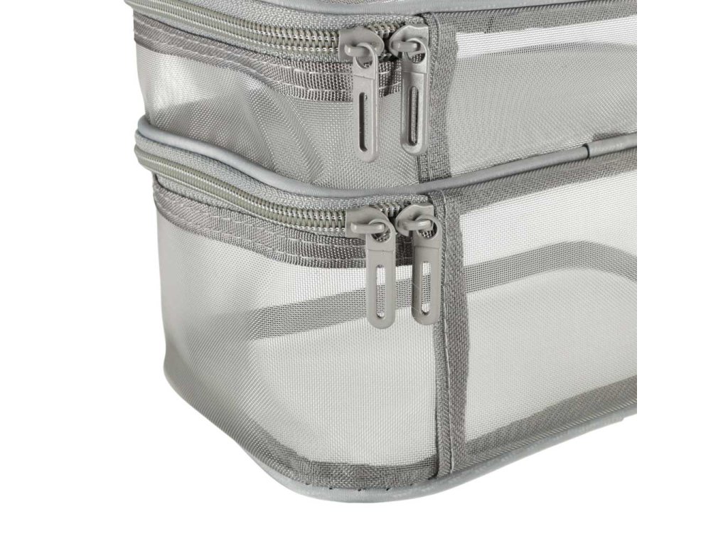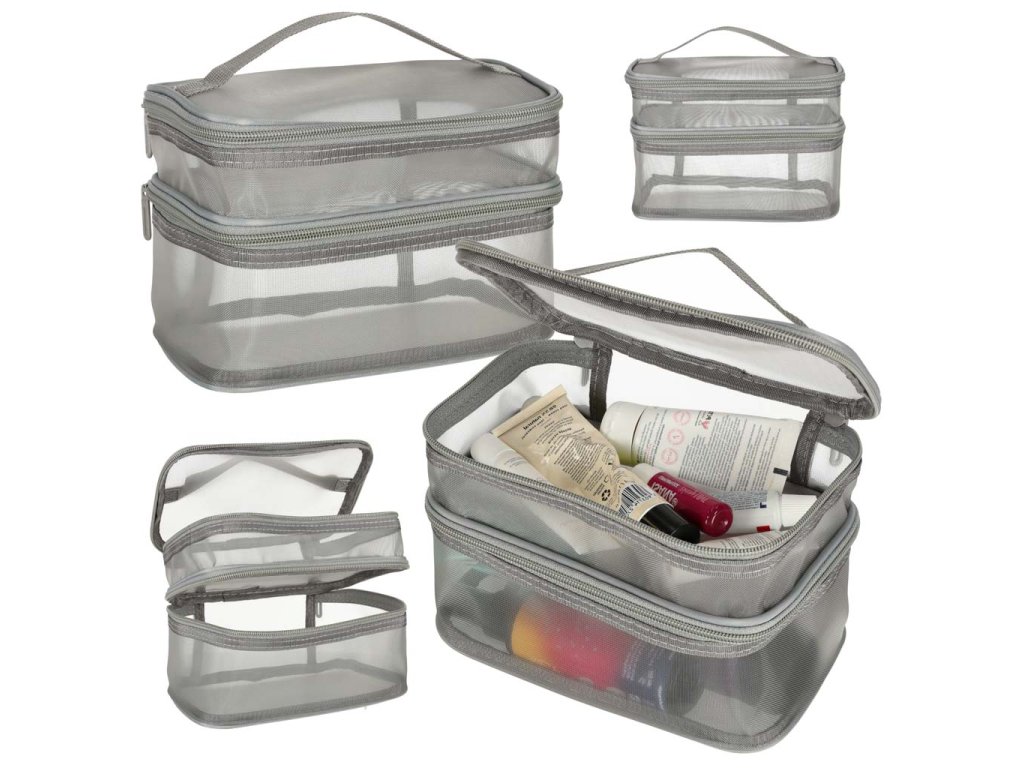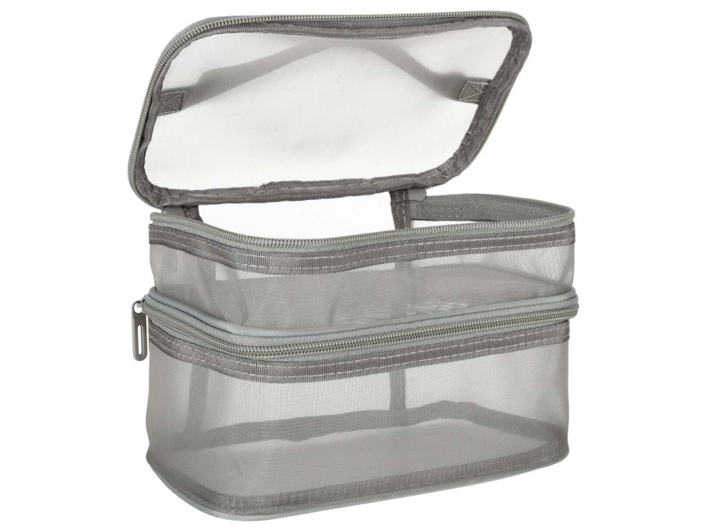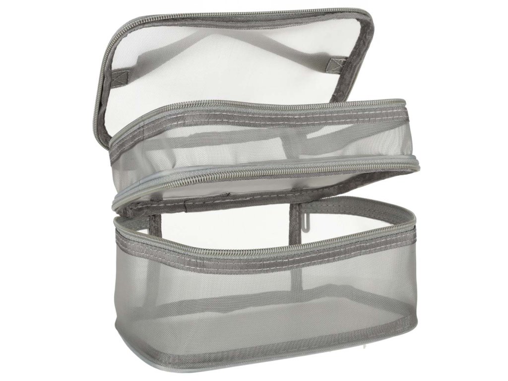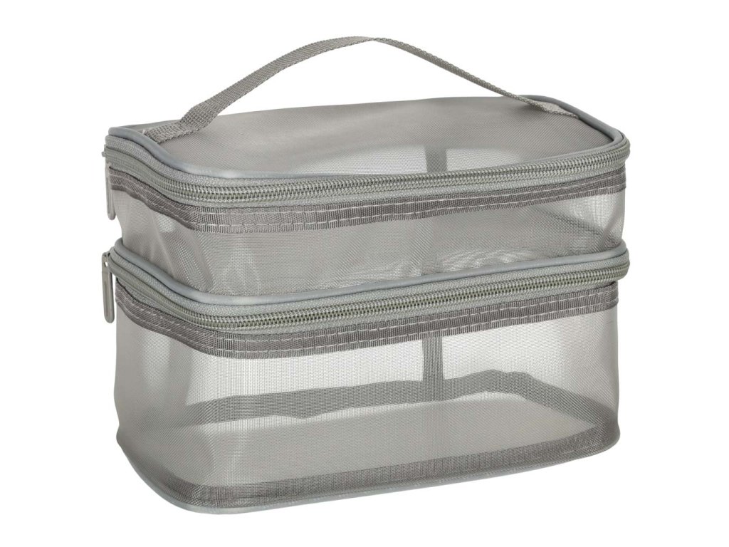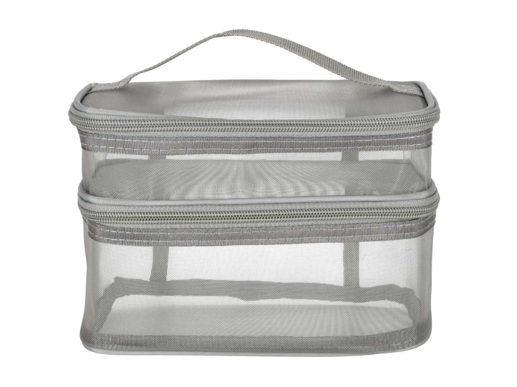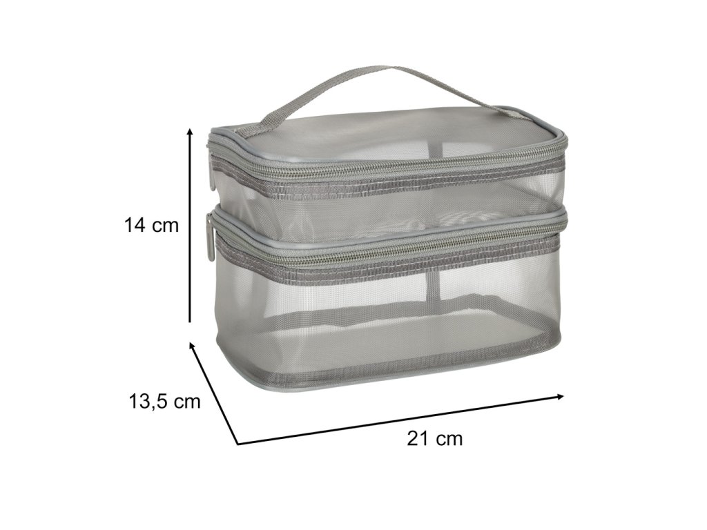 Praktická cestovní kosmetická taška - je nezbytnou výbavou na každé cestě. Díky svému dvouúrovňovému designu umožňuje uspořádat vaši kosmetiku. Zapíná se na oboustranný zip. Je vyrobena ze síťovaného materiálu, který usnadňuje hledání ukrytých produktů. Má praktickou rukojeť pro pohodlné přenášení.