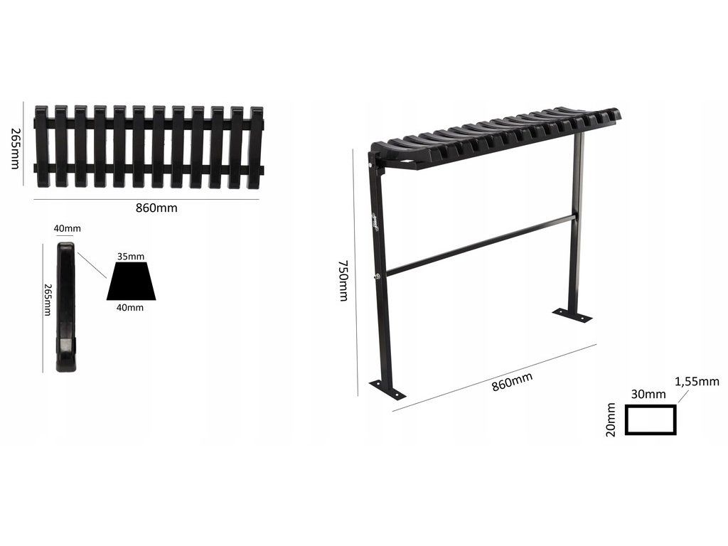 V balení jsou profily, které lze připevnit ke konstrukci lavičky, což umožňuje snadné a rychlé upevnění lavičky k podkladu, např. na dlažební kostky nebo betonové desky.