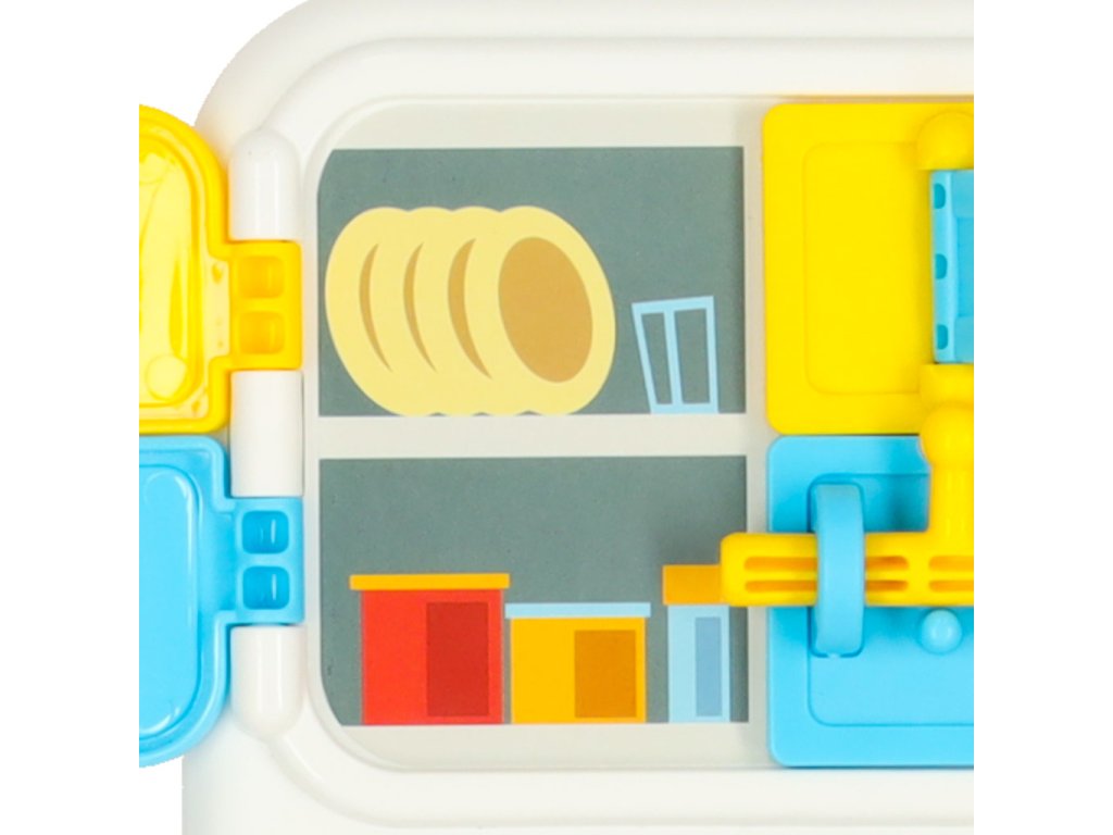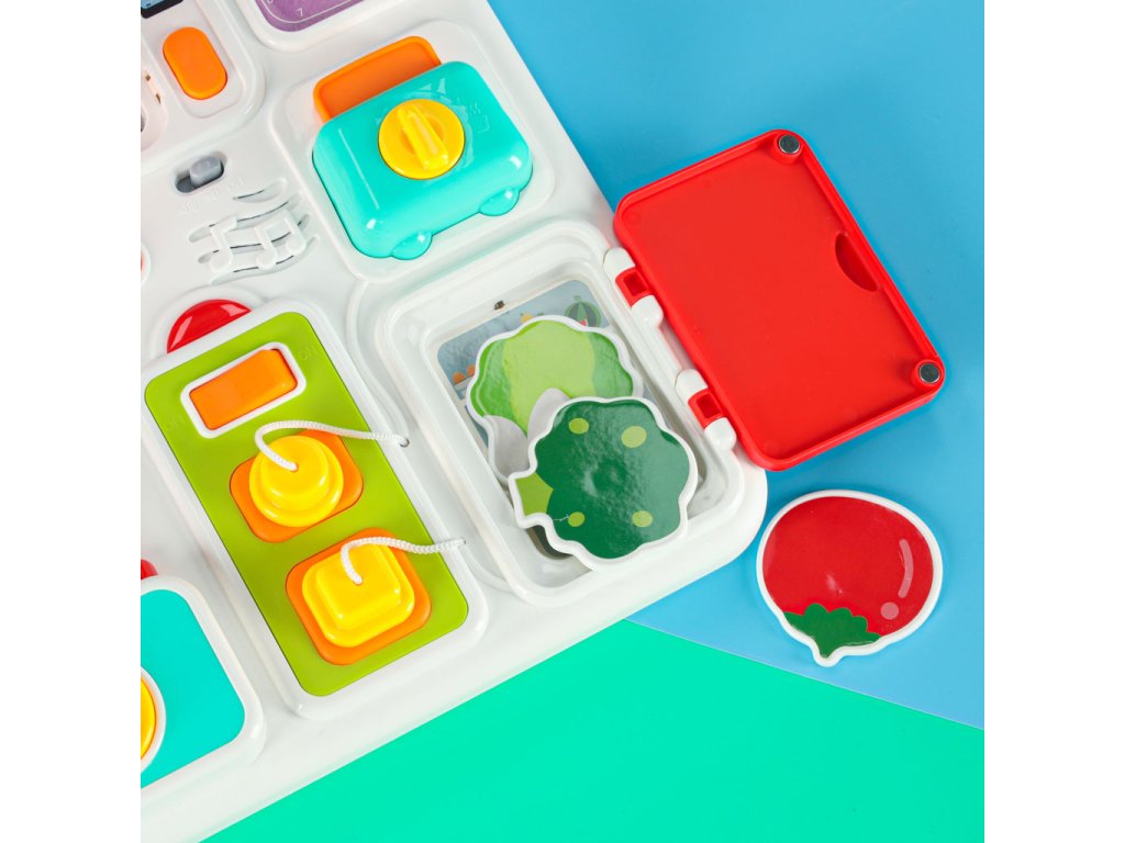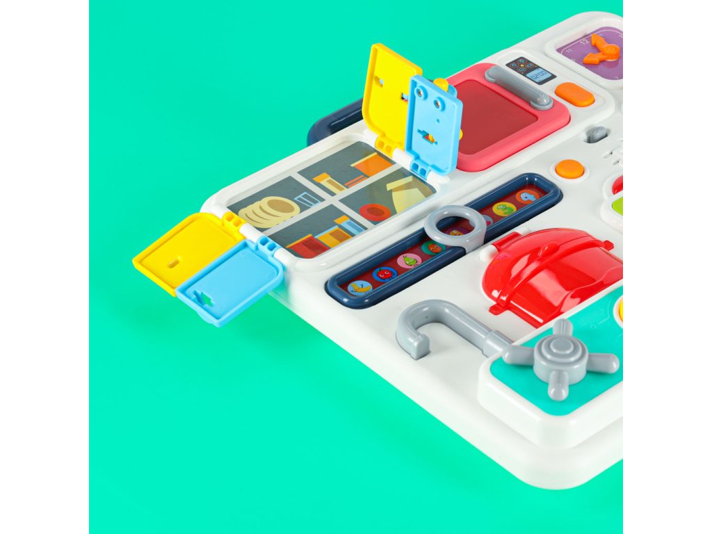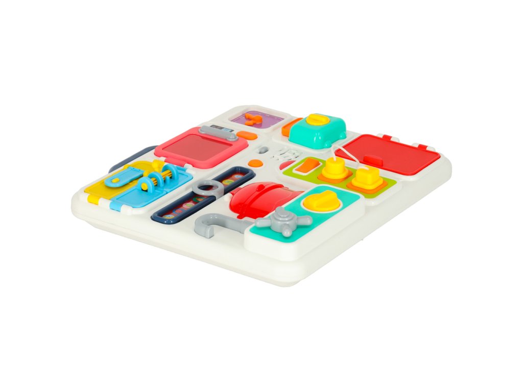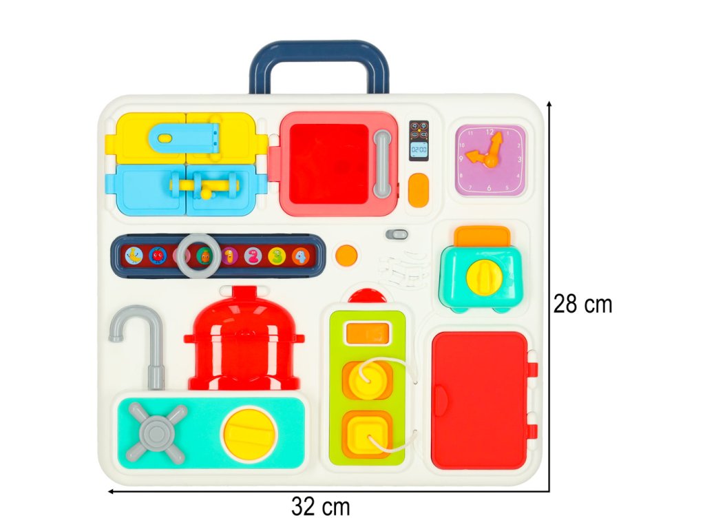 Je to nejen estetická pomůcka, ale především nástroj podporující rozvoj vašeho dítěte. Manipulační deska v kufříku podněcuje představivost, podporuje objevování, učí logickému myšlení a podporujerozvoj motoriky a koordinace. Při hře dítě zapojuje více smyslů - hmat,sluch a zrak - a učení hrou je tak mimořádně efektivní a příjemné. Každý prvekhrací desky byl navržen tak, aby podněcoval zvědavost a povzbuzoval dítě k samostatnému objevování funkcí. Otáčecíknoflíky, otevírací dvířka,realistické zvuky a světelné efekty zajišťují, že manipulační tabule neomrzí ani po mnoha týdnech používání.