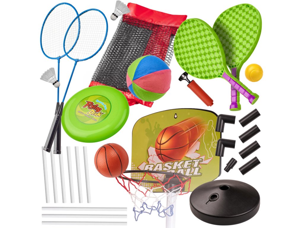 Sada obsahuje příslušenství potřebné pro badminton, volejbal, basketbal, tenis a frisbee. Sada je přizpůsobena výšce nejmenších hráčů - volejbalová a badmintonová síť je vysoká 126 cm a basketbalový koš je vysoký 227 cm. To poskytuje dítěti pohodlí a uspokojení ze hry bez ohledu na věk nebo schopnosti.