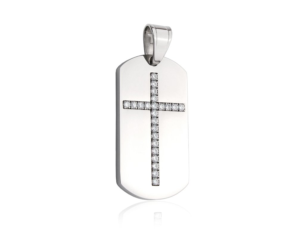 - přívěšek ve tvaru psí známky zdobený zirkonovým křížkem,