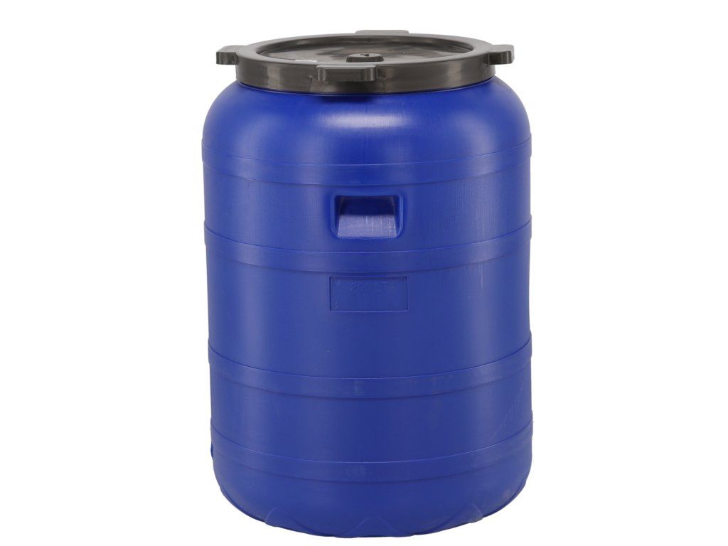 Velký sud o objemu 200 litrů, vyrobený z odolného materiálu v modré barvě. Ideální pro skladování a přepravu kapalin a jiných látek.