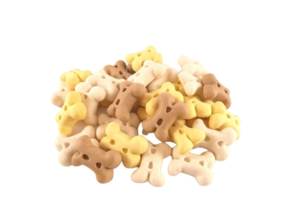 Lahodné a křupavé pamlsky pro vaše štěňátko, vhodné jako odměna a motivace při výcviku. Díky speciální chutné receptuře jsou sušenky pro vašeho psa neodolatelné. Pochoutka podporuje přirozené mechanické čištění zubů.Složení: obiloviny , cukry, tuky, maso a živočišné deriváty, minerály ( pšeničná mouka 66,0%-B 65,7%-Ž 65,2%-H, glukóza 25,0%-B 25,0%-Ž, 25,0%-H, řepkový olej 3,4%-B,Ž,H , kuřecí tuk 3,4%-B,Ž,H; kuřecí maso dehydratované 1,0%-B,Ž,H; chlorid sodný 0,67%-B 0,68%-Ž 0,67%-H; hydrogensiřičitan sodný 0,35%-B,Ž,H; vanilkové aroma 0,14%-B,%Z,H; přírodní smíšené tokoferoly 0,1%-B,Ž,H; karamel 0,74%-H; barvivo tartrazin 0,25%-Ž Analytické složení: hrubý protein (dusíkaté látky) 8,3%, hrubý tuk 7,5%, anorganické látky 1,8%, hrubá vláknina 1,7%, vlhkost 11,0%. Doplňkové látky (na kg): barviva FD&C žlutá 5 - Tartrazin 2A102 42 mg, karamel 2a150a 2467 mg, aroma: vanilkové aroma 1400 mg, Antioxidanty: extrakt tokoferolů z rostlinného oleje (1b306 (i)) 120 mg. Metabolická energie 3673 kcal/kg.Dbejte na dostatek pitné vody! Velikost: cca 2cm Pozn: B-bílá složka, Ž-žlutá složka, H-hnědá složkaDoplňkové parametry